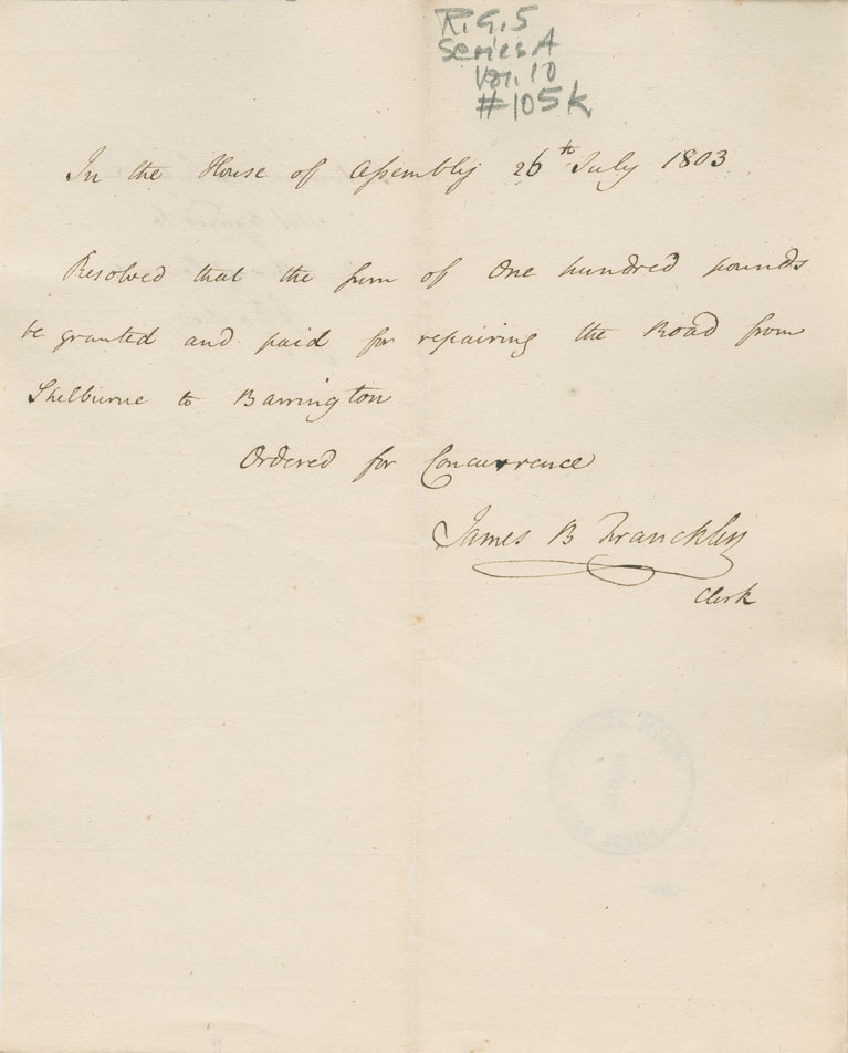 Reference: Nova Scotia House of Assembly Nova Scotia Archives RG 5 Series A volume 10 number 105