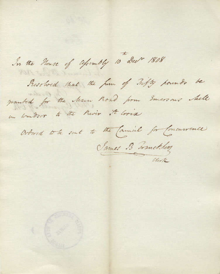 Eighty-three resolutions of the House of Assembly for granting sums for improving the roads and bridges throughout the province. Signed. Agreed to by the Council.