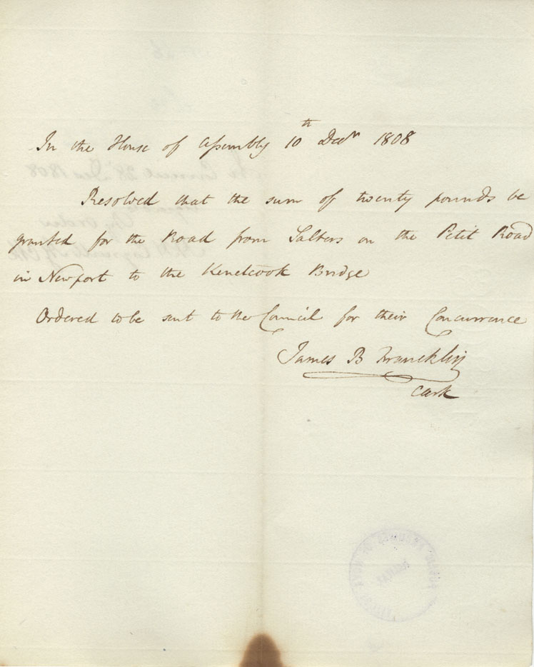 Eighty-three resolutions of the House of Assembly for granting sums for improving the roads and bridges throughout the province. Signed. Agreed to by the Council.