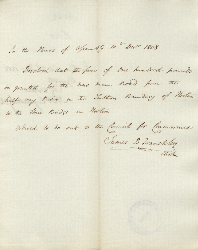 Eighty-three resolutions of the House of Assembly for granting sums for improving the roads and bridges throughout the province. Signed. Agreed to by the Council.