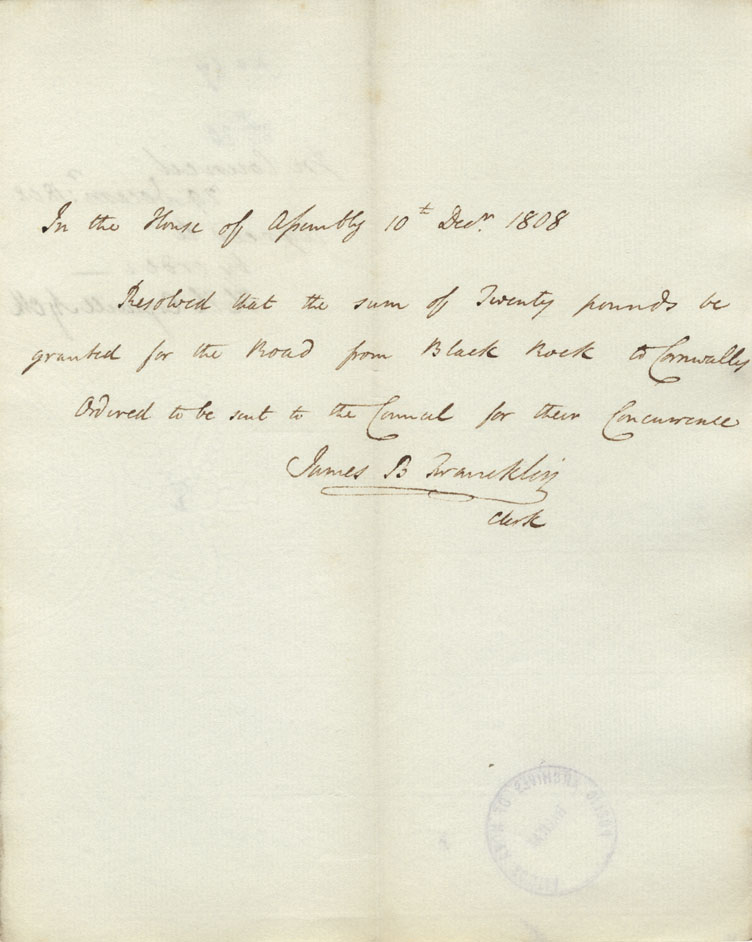 Eighty-three resolutions of the House of Assembly for granting sums for improving the roads and bridges throughout the province. Signed. Agreed to by the Council.