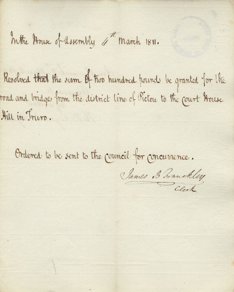Reference: Nova Scotia House of Assembly Nova Scotia Archives RG 5 Series A volume 17 number 49