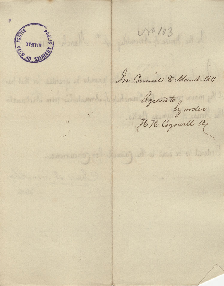 Reference: Nova Scotia House of Assembly Nova Scotia Archives RG 5 Series A volume 17 number 49