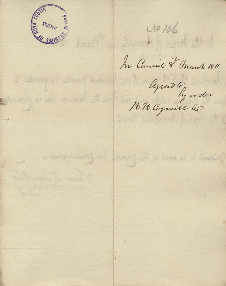 Reference: Nova Scotia House of Assembly Nova Scotia Archives RG 5 Series A volume 17 number 49