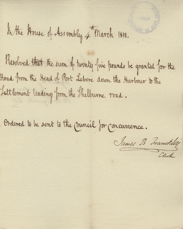 Reference: Nova Scotia House of Assembly Nova Scotia Archives RG 5 Series A volume 17 number 49