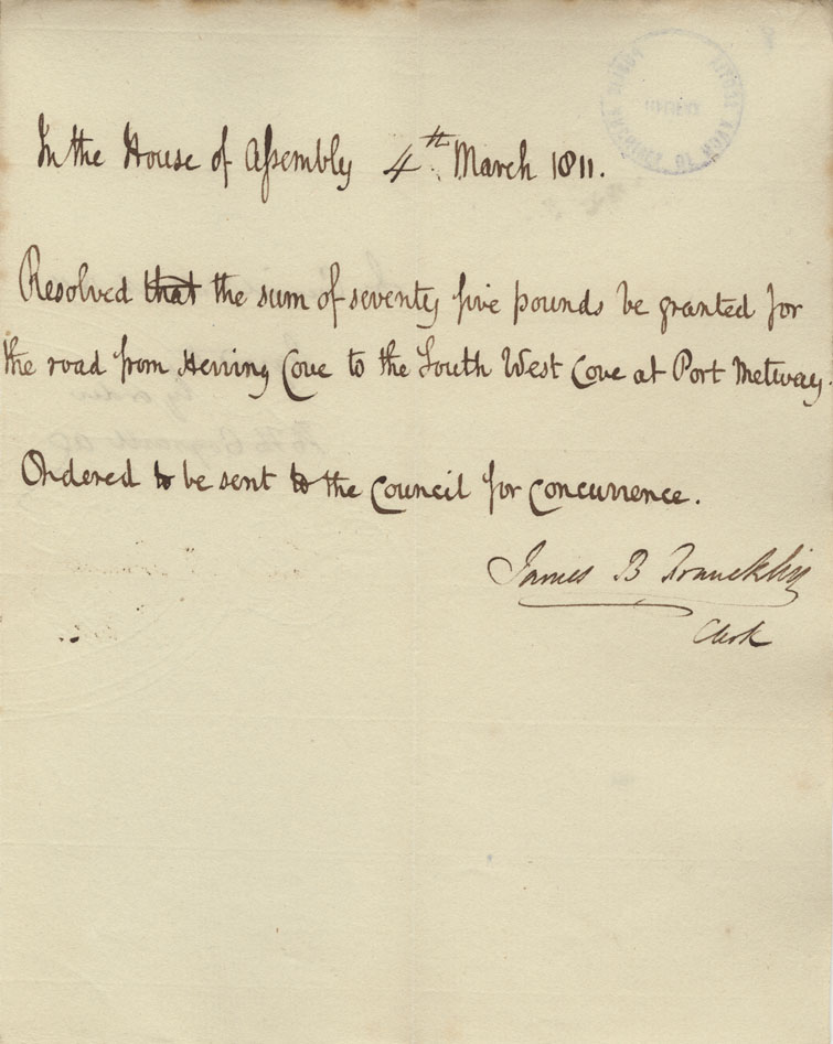 Reference: Nova Scotia House of Assembly Nova Scotia Archives RG 5 Series A volume 17 number 49