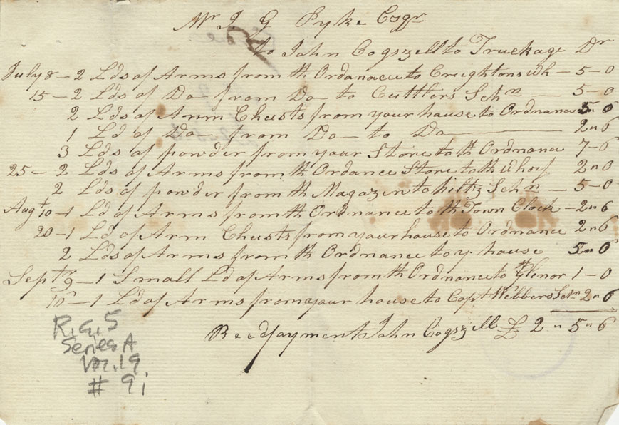 Account, Province of Nova Scotia with John George Pyke, Quarter-Master General of the militia for carriage of arms, etc. and various enclosed accounts, notes and invoices.