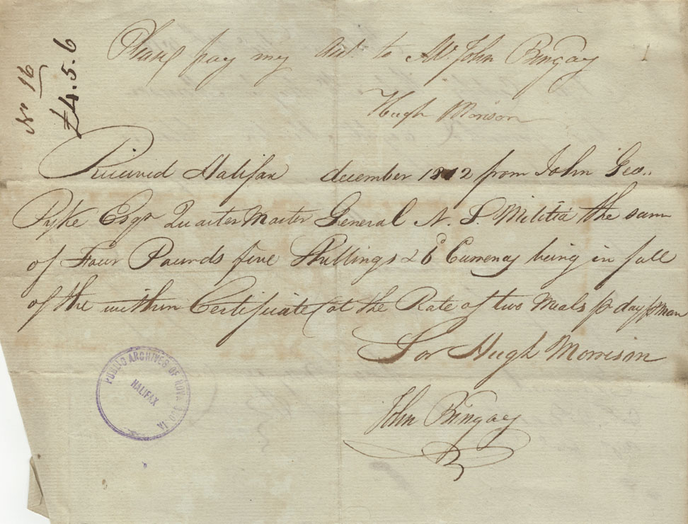 Account of John George Pyke, Adjutant-General of Militia, for victualling part of the militia from 18 November 1812 to 16 February 1813, with vouchers, bills, etc. for other militia expenses.