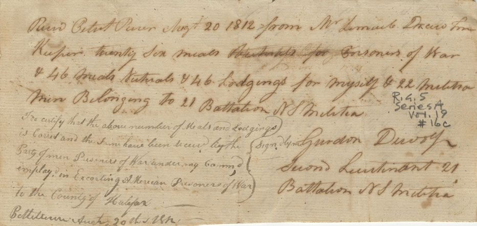 Account of John George Pyke, Adjutant-General of Militia, for victualling part of the militia from 18 November 1812 to 16 February 1813, with vouchers, bills, etc. for other militia expenses.