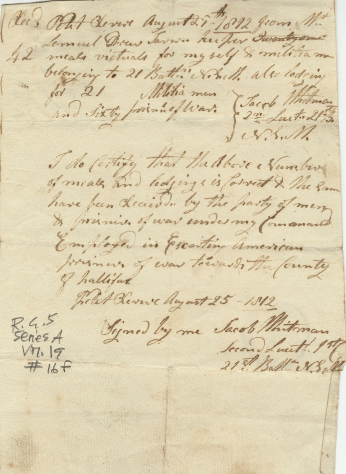 Account of John George Pyke, Adjutant-General of Militia, for victualling part of the militia from 18 November 1812 to 16 February 1813, with vouchers, bills, etc. for other militia expenses.