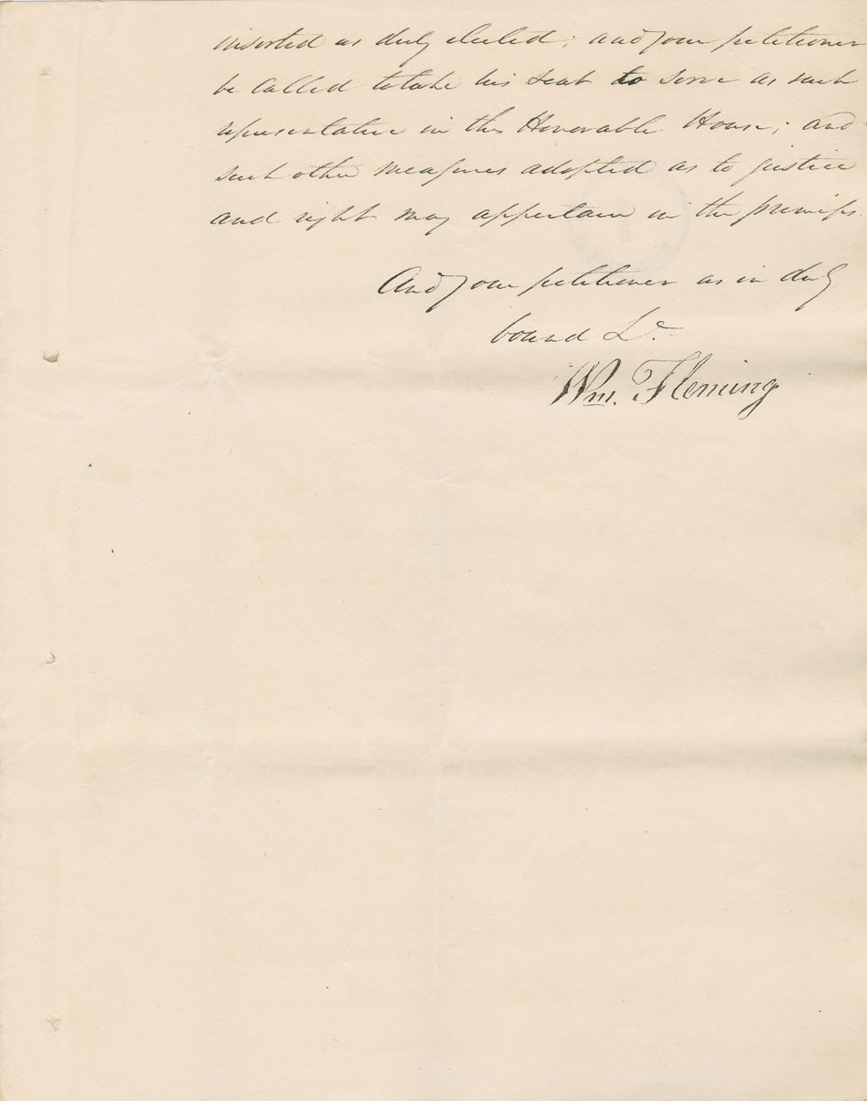 Petition of William Fleming, Truro, requesting that the winner of the election, Charles Archibald, be disqualified on the grounds that he does not meet the ownership of land requirement and that the man he defeated Mr. Fleming, be admitted to the House of Assembly as the member for Colchester