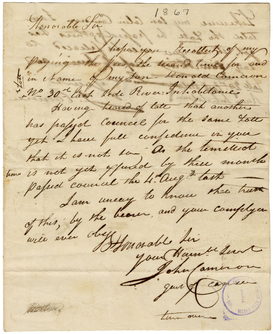 Petition to Ainslie: John Cameron petitions in behalf of his son, Donald, who is on a voyage to Newfoundland. He asks that lot 30, River Inhabitants, for which Donald holds a warrant, be held for him, and not be given to other applicants. Letter to Surveyor, Ward.