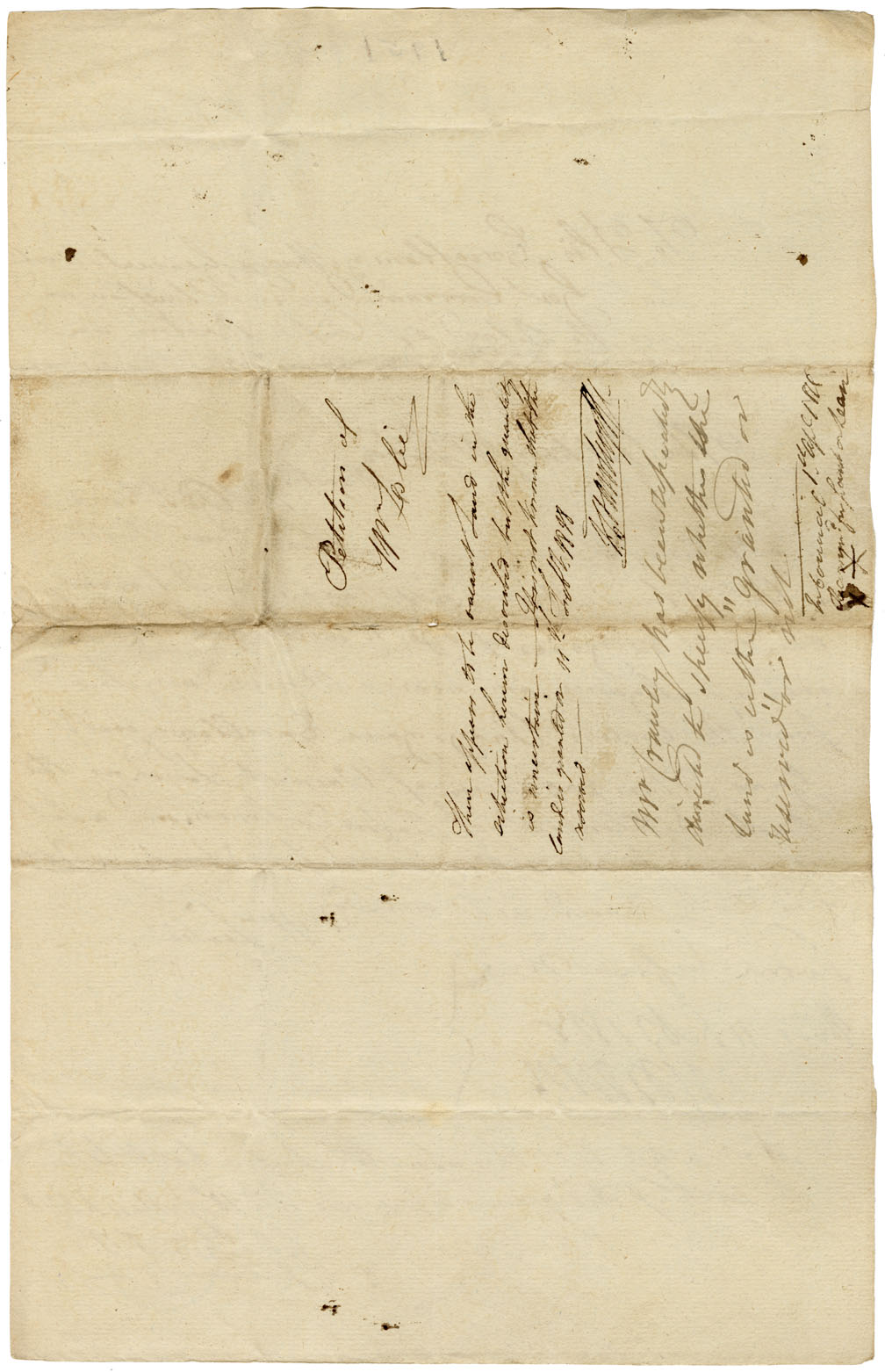 Petition to Ainslie: Petitioner, age 22, emigrated from Dundee, Scotland, two years before. He has a wife and one child. He asks a lot in "the back settlement of John Floren and a lot reserved for a mill and Philip Sparling". Note: recommended.
