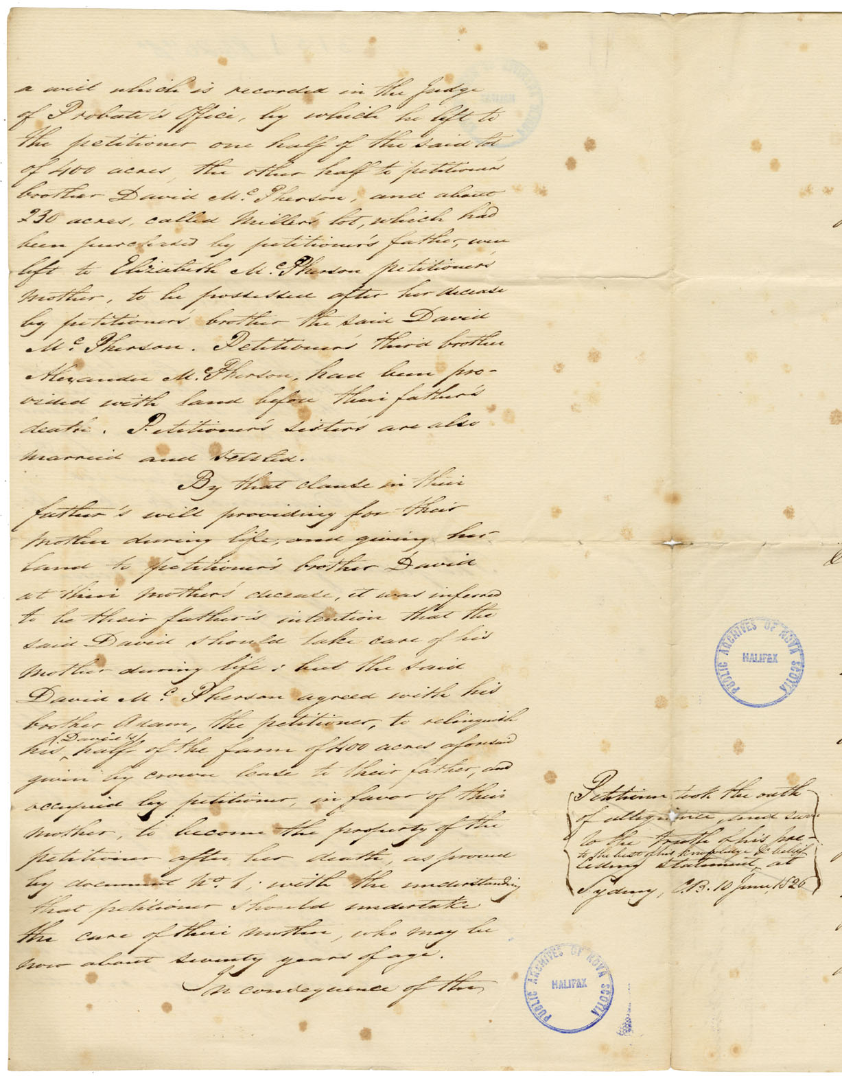 Petition to Kempt: Petitioner is a native of Edinborough, age 37, married, and has three children. He has for many years been settled on a 400 acres farm at the River Inhabitants, for which his father held a crown lease and for which petitioner now asks a grant. The father, Alexander McPherson, died nine years ago and left this lot to the sons, petitioner and his brother David, also 230 acres which had been purchased to the widow, Elizabeth McPherson. A third brother, Alexander, had been provided with land before the father's death, his sisters are also married and settled. David exchanged his share of the land willed him for the mother's lot with the brother Adam, to become his property after the mother's death. The mother has lived with him until the preceding fall when she went to live with David at the Gut of Canso, and petitioner fears that David may, under this circumstance recede from the original bargain. Certificate on behalf of the petitioner, signed by Hector McKinnon, Duncan Cameron, and Malcolm MacDonald. Statement by Crawley recommending the petitioner. Petitioner objected to taking any oath from fear of obligations any oath would impose on him. Note: the two brothers may have a grant in common according to the father's will.