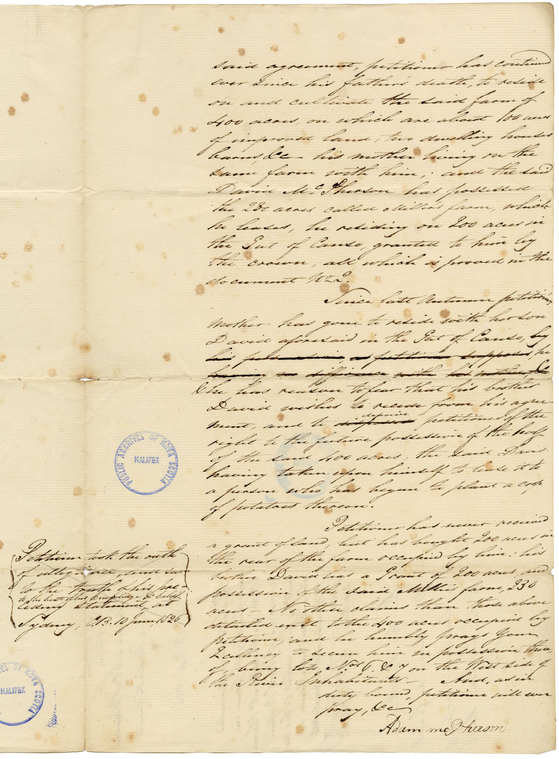 Petition to Kempt: Petitioner is a native of Edinborough, age 37, married, and has three children. He has for many years been settled on a 400 acres farm at the River Inhabitants, for which his father held a crown lease and for which petitioner now asks a grant. The father, Alexander McPherson, died nine years ago and left this lot to the sons, petitioner and his brother David, also 230 acres which had been purchased to the widow, Elizabeth McPherson. A third brother, Alexander, had been provided with land before the father's death, his sisters are also married and settled. David exchanged his share of the land willed him for the mother's lot with the brother Adam, to become his property after the mother's death. The mother has lived with him until the preceding fall when she went to live with David at the Gut of Canso, and petitioner fears that David may, under this circumstance recede from the original bargain. Certificate on behalf of the petitioner, signed by Hector McKinnon, Duncan Cameron, and Malcolm MacDonald. Statement by Crawley recommending the petitioner. Petitioner objected to taking any oath from fear of obligations any oath would impose on him. Note: the two brothers may have a grant in common according to the father's will.