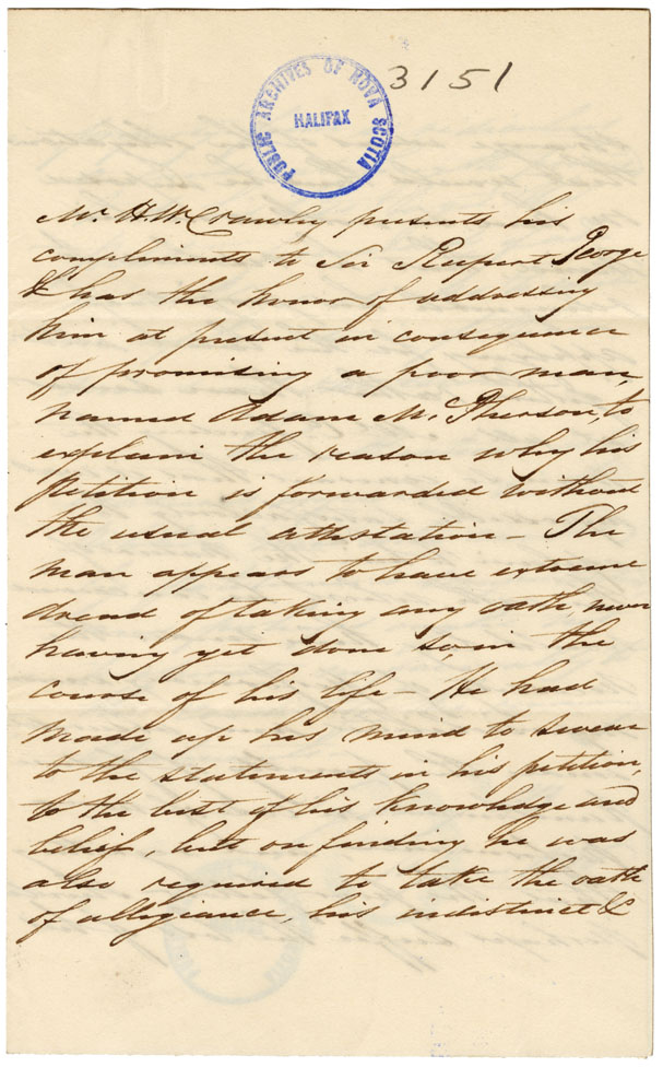 Petition to Kempt: Petitioner is a native of Edinborough, age 37, married, and has three children. He has for many years been settled on a 400 acres farm at the River Inhabitants, for which his father held a crown lease and for which petitioner now asks a grant. The father, Alexander McPherson, died nine years ago and left this lot to the sons, petitioner and his brother David, also 230 acres which had been purchased to the widow, Elizabeth McPherson. A third brother, Alexander, had been provided with land before the father's death, his sisters are also married and settled. David exchanged his share of the land willed him for the mother's lot with the brother Adam, to become his property after the mother's death. The mother has lived with him until the preceding fall when she went to live with David at the Gut of Canso, and petitioner fears that David may, under this circumstance recede from the original bargain. Certificate on behalf of the petitioner, signed by Hector McKinnon, Duncan Cameron, and Malcolm MacDonald. Statement by Crawley recommending the petitioner. Petitioner objected to taking any oath from fear of obligations any oath would impose on him. Note: the two brothers may have a grant in common according to the father's will.