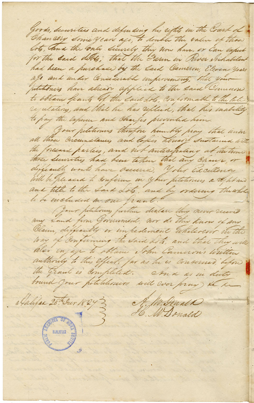 Petition to Kempt: Petitioners are merchants of Halifax. They ask a grant of certain lands held by George Taylor, merchant of Arichat, and of land owned by John Cameron. Taylor purchased the lands, sometimes at extravagant prices. He was indebted to petitioners for 1600 who foreclosed the mortgage in 1824, and bought in the lands at Chancery sale to prevent loss. Some of these lands are held by lease only. Schedule of lots. Plan. Agreement of sale from Ranald McKinnon and Henry Taylor, merchant.
