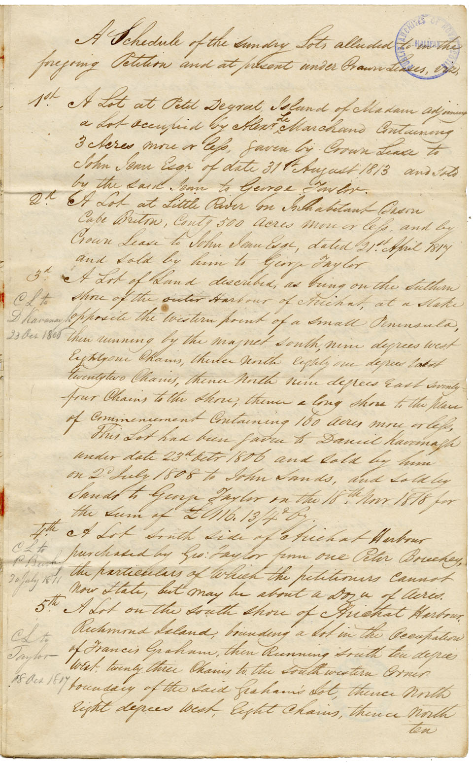 Petition to Kempt: Petitioners are merchants of Halifax. They ask a grant of certain lands held by George Taylor, merchant of Arichat, and of land owned by John Cameron. Taylor purchased the lands, sometimes at extravagant prices. He was indebted to petitioners for 1600 who foreclosed the mortgage in 1824, and bought in the lands at Chancery sale to prevent loss. Some of these lands are held by lease only. Schedule of lots. Plan. Agreement of sale from Ranald McKinnon and Henry Taylor, merchant.