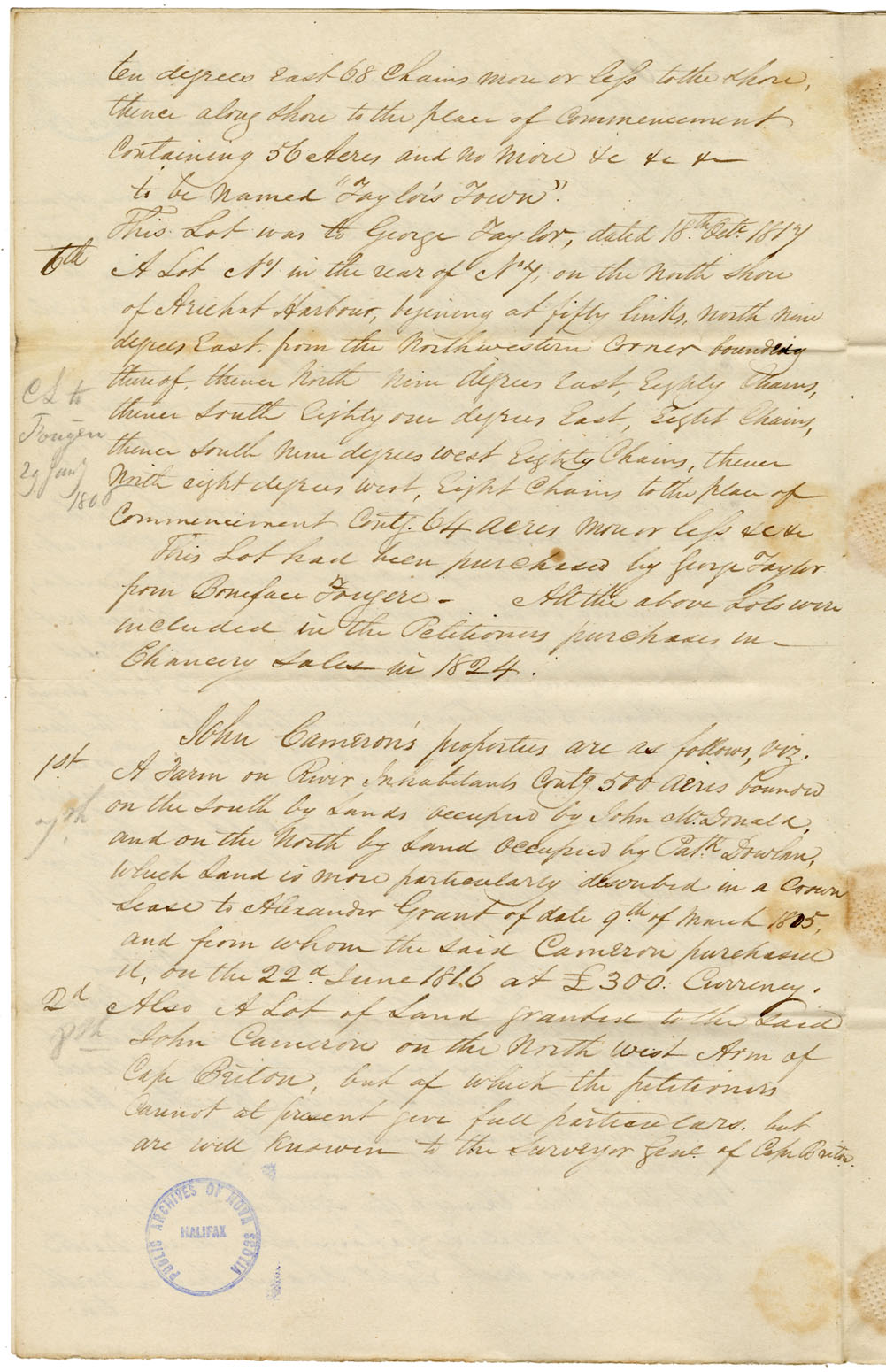 Petition to Kempt: Petitioners are merchants of Halifax. They ask a grant of certain lands held by George Taylor, merchant of Arichat, and of land owned by John Cameron. Taylor purchased the lands, sometimes at extravagant prices. He was indebted to petitioners for 1600 who foreclosed the mortgage in 1824, and bought in the lands at Chancery sale to prevent loss. Some of these lands are held by lease only. Schedule of lots. Plan. Agreement of sale from Ranald McKinnon and Henry Taylor, merchant.