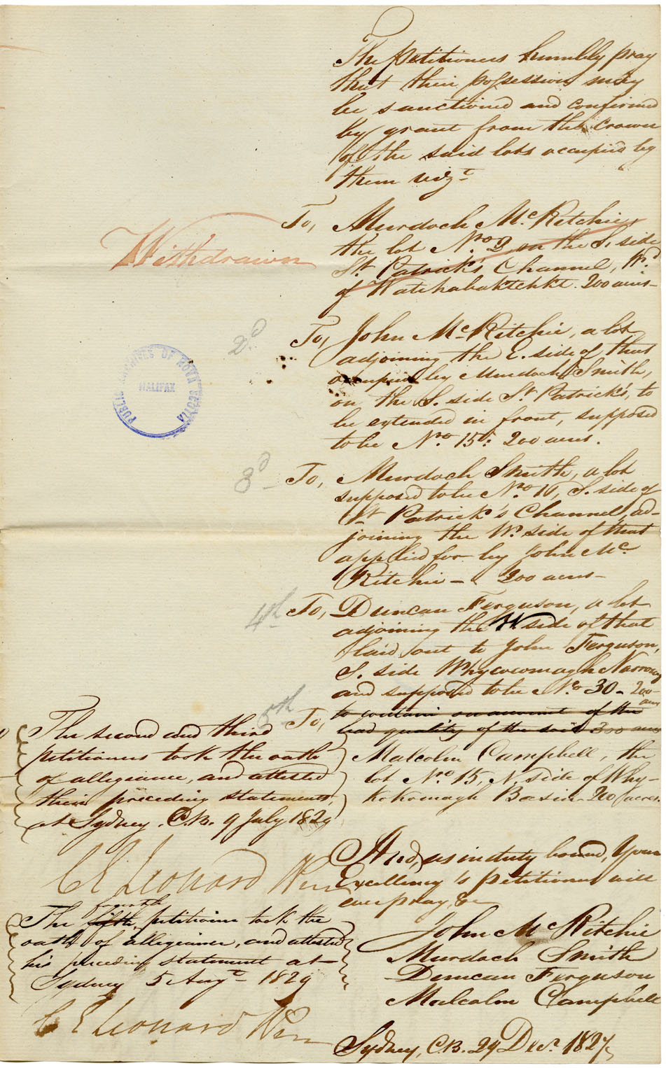 Petition to Kempt: Petitioners, natives of Scotland, ask titles to their lands on the south side of St. Patrick's Channel. Murdoch McRitchie, age 32, is married and has one child. He has lived two years on lot 2. [Petition withdrawn] John McRitchie, age 60, is married and has five children. He has lived two years on lot 15. He asks a wider frontage. Murdoch Smith, age 47, is married and has six children. He has lived three years on lot 16. Duncan Ferguson, age 28, married, has lived two years on lot 30, south side of Whycocomah Narrows. Malcolm Campbell, age 26, single, has been four years on lot 15, north side of Whykokomagh Basin. Note: approved. Murdoch McRitchie, John McRitchie, Murdoch Smith, Duncan Ferguson, and Malcolm Campbell.