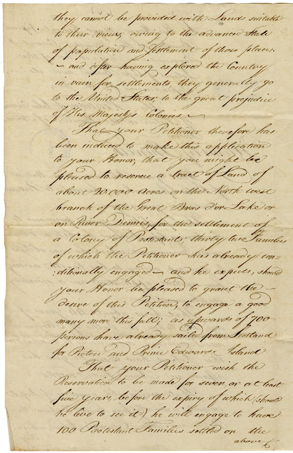 Two petitions to Nepean. Petitioner, age 44, was, six years before, obliged to give up a government position in Scotland on account of ill health. He came to Pictou. He asks a reserve of 20,000 acres on the north-west branch of the Great Bras d'Or Lake for the settlement of a colony of Protestants, 32 families of which petitioner has already conditionally engaged. Many more will come, as upwards of 700 persons have this fall sailed for Nova Scotia and Prince Edward Island. These people, if they cannot find suitable settlement, will go on to the United States. Petitioner asks that the reservation be made for seven or at least five years, and he will engage to have 100 families settled there. Note: 10,000 acres for two years. Petition 2 asks for a small peninsula south of Cape Portland, called Fourche, which partly forms Forked Harbour. Granted. Two reports from Crawley to Clarke: 600 acres on the west side of the River Inhabitants. Plan: 280 acres on the west side of the River Inhabitants. Plan.