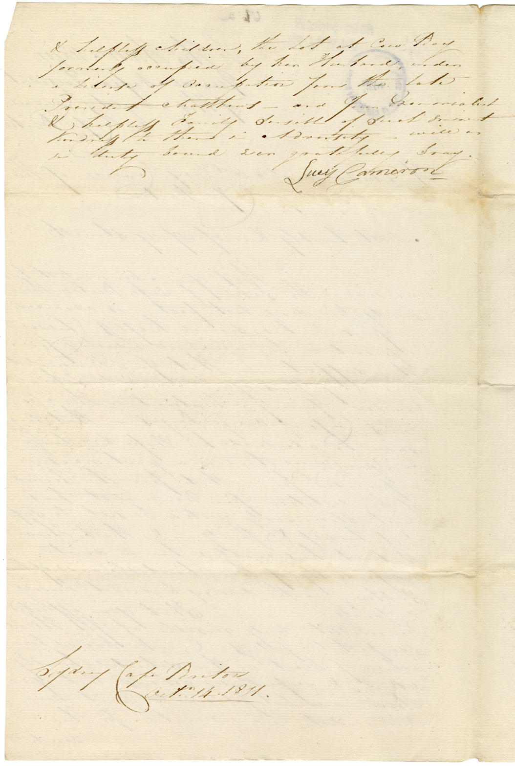 Petition to Nepean: Petitioner has lived in Cape Breton for 25 years. Many years before she was married to John Cameron, a lieutenant in the Orange Rangers, who abandoned his wife and large family. Petitioner has since supported herself and family without public aid. She asks a lease of a lot at Cow Bay which her husband held under licence from Pres. Matthews. Note: complied with.