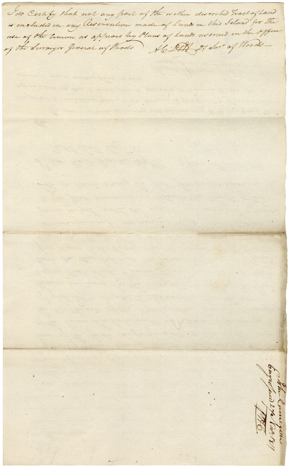 Two petitions to Nepean. Petitioner, age 44, was, six years before, obliged to give up a government position in Scotland on account of ill health. He came to Pictou. He asks a reserve of 20,000 acres on the north-west branch of the Great Bras d'Or Lake for the settlement of a colony of Protestants, 32 families of which petitioner has already conditionally engaged. Many more will come, as upwards of 700 persons have this fall sailed for Nova Scotia and Prince Edward Island. These people, if they cannot find suitable settlement, will go on to the United States. Petitioner asks that the reservation be made for seven or at least five years, and he will engage to have 100 families settled there. Note: 10,000 acres for two years. Petition 2 asks for a small peninsula south of Cape Portland, called Fourche, which partly forms Forked Harbour. Granted. Two reports from Crawley to Clarke: 600 acres on the west side of the River Inhabitants. Plan: 280 acres on the west side of the River Inhabitants. Plan.
