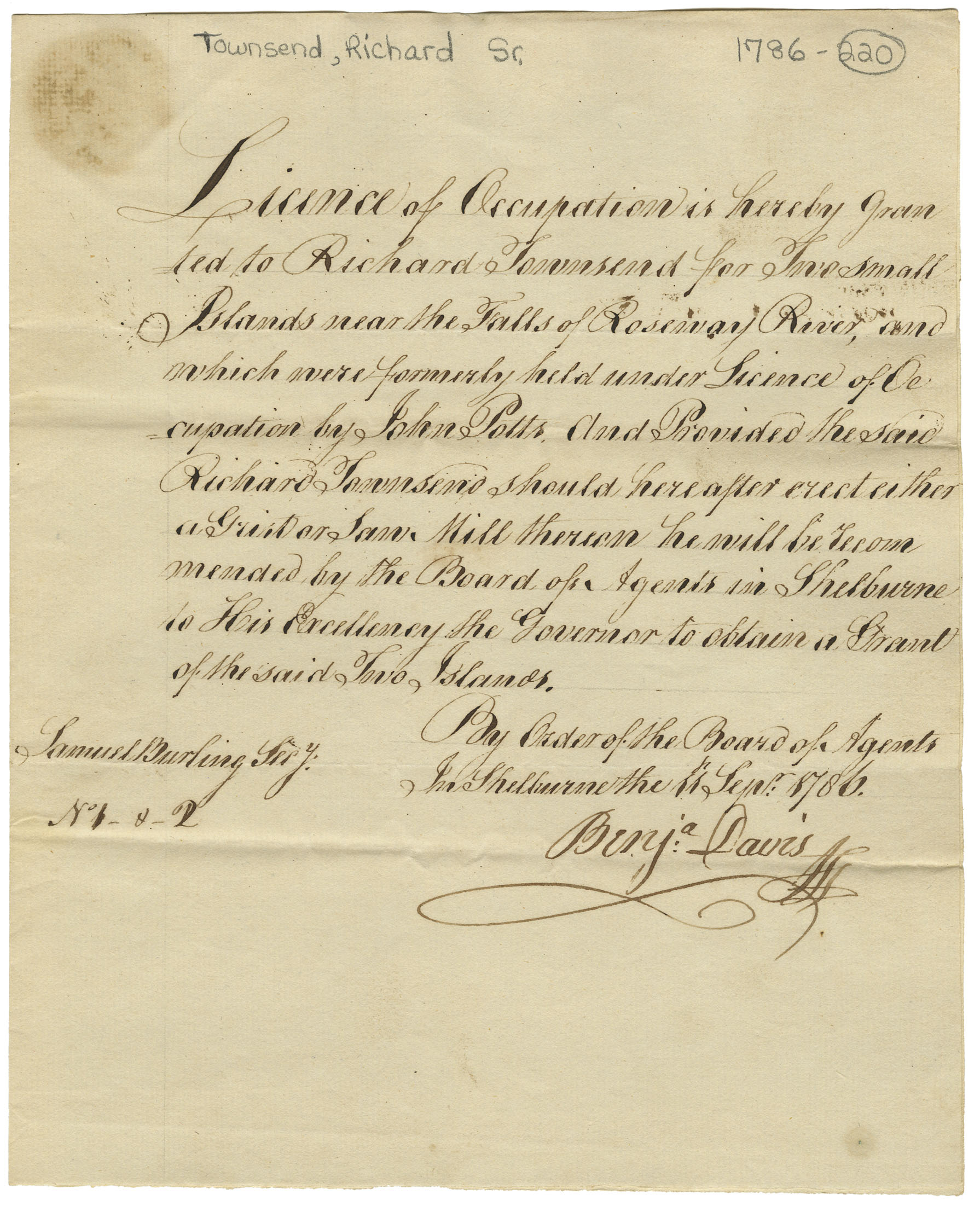 Memorialist has a license of occupation from the Board of Agents, for two small islands near the falls of the Roseway River. Owns land on the west side of the river, where he has erected a grist mill, which "would be rendered useless without the possession of the said island as they constitute one side of the mill dam. Prays for a grant of the islands.