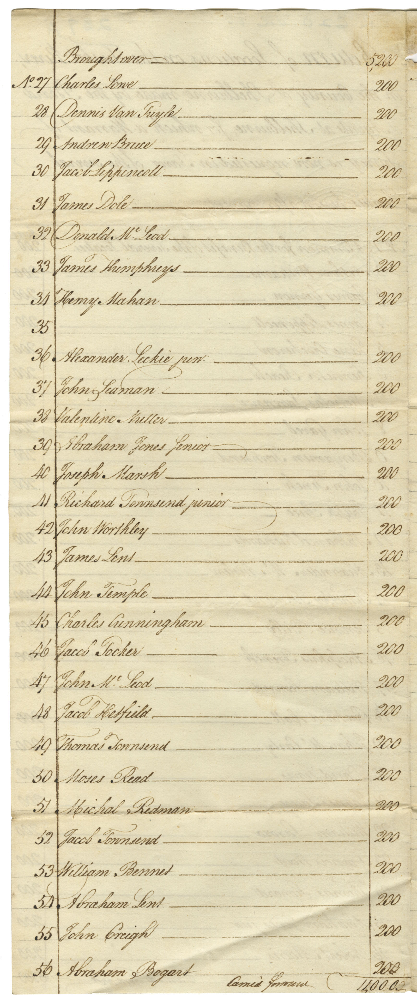Names listed in the documents: Arthur Williams, James Lippincott, Kenneth Reach, John Gavel, John Tench, James Gernon, Jane Crocheron, Benjamin Townsend, Joesph Price, Nathaniel Richards, Timothy Townsend, Adolphus French, Richard Hall, David Lewis, William Laroza, Thomas Leonard, Robert Morris, Dennis Van Tuyle, James Dole, Alexander McAuslen, Terence Reilly, William Leonard, John McCartney, James Lacey, Francis Wood, Abraham, Jr. Jones, Charles Lowe, Jacob Lippincott, Donald McLeod, James Humphreys, Alexander, Jr. Leckie, Valentine Nutter, Joseph Marsh, John Worthley, John Temple, Jacob Tocker [Tooker, Tucker], Jacob Hetfield [Hatfield], Moses Read, Jacob Townsend, Henry Mahan, John Seaman, Abraham, Sr. Jones, Richard, Jr. Townsend, James Lent, Charles Cunningham, John McLeod, Thomas Townsend, Michael Redman, William Bennet, Abraham Lent, Abraham Bogart, Andrew Wilson, Job Smith, Abraham Van Buskirk, William Moluck, Job Hetfield, Richard Cornbauld, Thomas Middleton, Robert Patterson, John Creigh, Lewis Blanchard, John Leonard, William Williamson, Jacob Williams, Jonathan Horton, William Sorrell, John Winants, Aaron White, James Hetfield, William Hervey, William Halstead, Alexander Gay, Richard, Sr. Townsend, John Williams, Andrew Bruce, Thomas Marsh, John Carpenter, Samuel Mann, Henry Sorrels, Isaac Mabey, John King