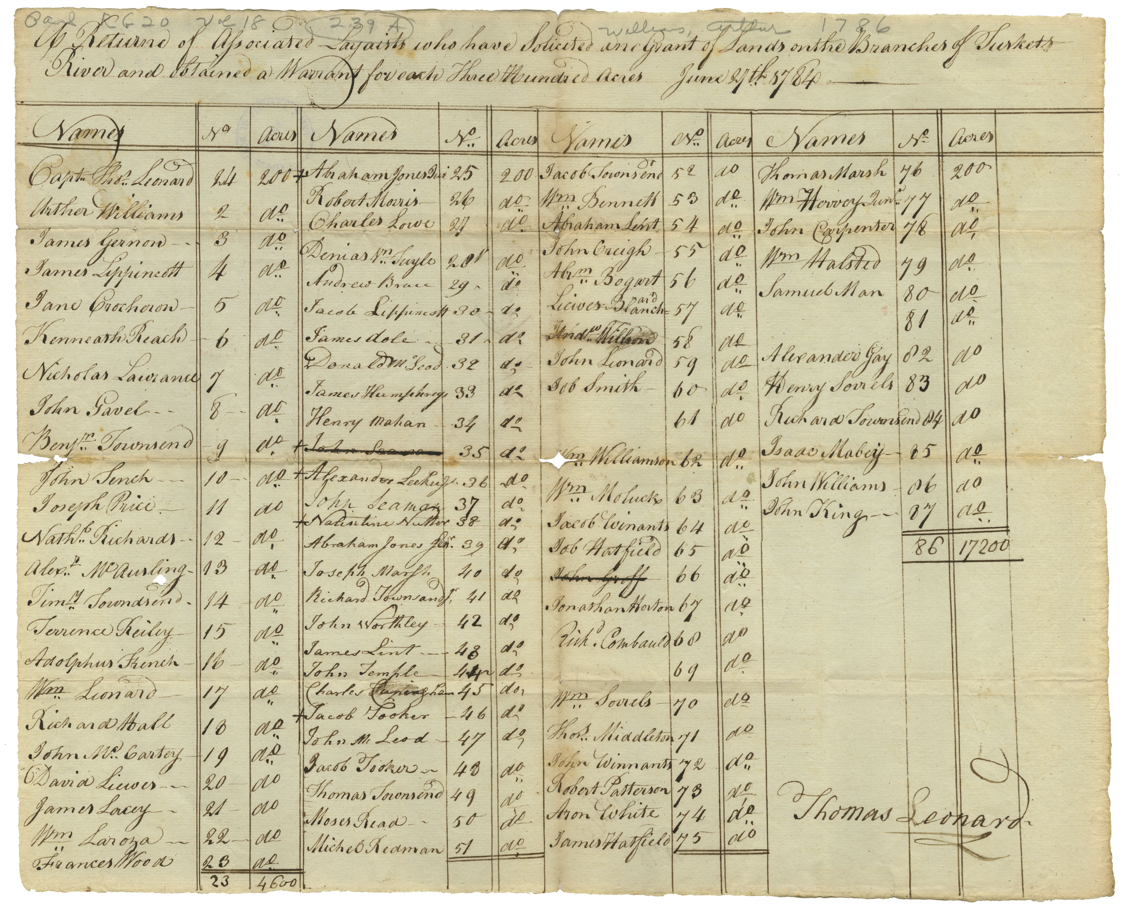 Names listed in the documents: Arthur Williams, James Lippincott, Kenneth Reach, John Gavel, John Tench, James Gernon, Jane Crocheron, Benjamin Townsend, Joesph Price, Nathaniel Richards, Timothy Townsend, Adolphus French, Richard Hall, David Lewis, William Laroza, Thomas Leonard, Robert Morris, Dennis Van Tuyle, James Dole, Alexander McAuslen, Terence Reilly, William Leonard, John McCartney, James Lacey, Francis Wood, Abraham, Jr. Jones, Charles Lowe, Jacob Lippincott, Donald McLeod, James Humphreys, Alexander, Jr. Leckie, Valentine Nutter, Joseph Marsh, John Worthley, John Temple, Jacob Tocker [Tooker, Tucker], Jacob Hetfield [Hatfield], Moses Read, Jacob Townsend, Henry Mahan, John Seaman, Abraham, Sr. Jones, Richard, Jr. Townsend, James Lent, Charles Cunningham, John McLeod, Thomas Townsend, Michael Redman, William Bennet, Abraham Lent, Abraham Bogart, Andrew Wilson, Job Smith, Abraham Van Buskirk, William Moluck, Job Hetfield, Richard Cornbauld, Thomas Middleton, Robert Patterson, John Creigh, Lewis Blanchard, John Leonard, William Williamson, Jacob Williams, Jonathan Horton, William Sorrell, John Winants, Aaron White, James Hetfield, William Hervey, William Halstead, Alexander Gay, Richard, Sr. Townsend, John Williams, Andrew Bruce, Thomas Marsh, John Carpenter, Samuel Mann, Henry Sorrels, Isaac Mabey, John King
