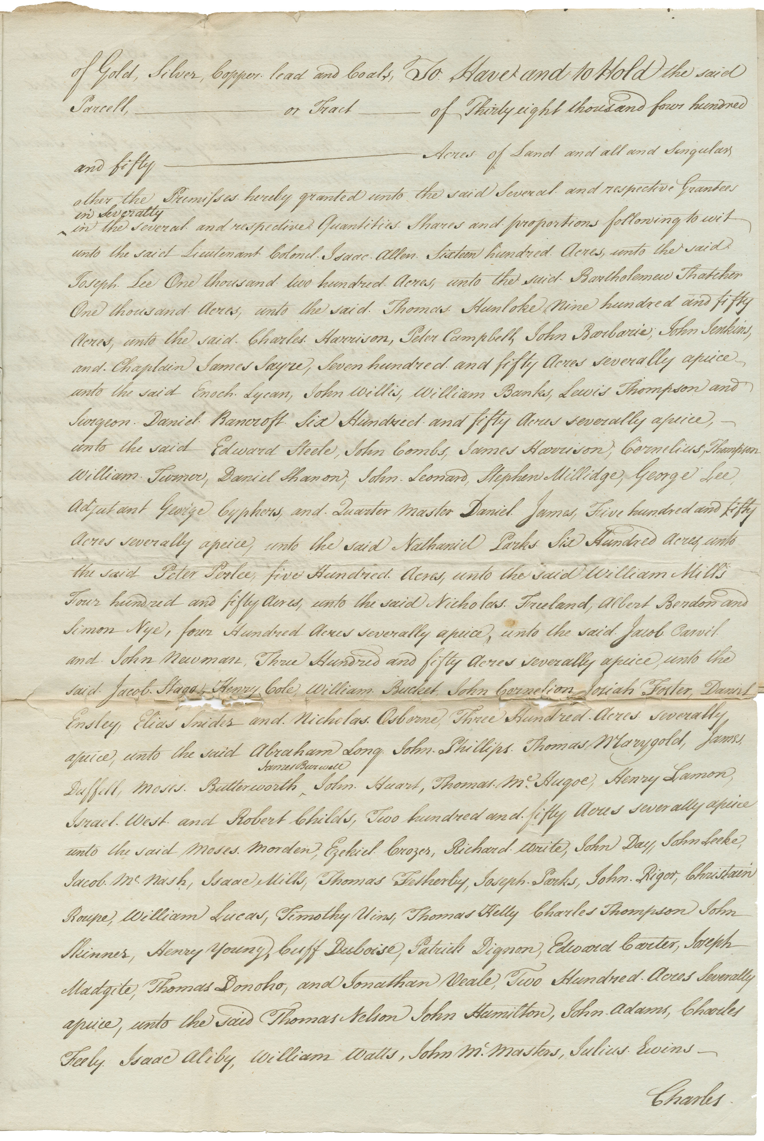 Names listed in the documents: (Lt. Col.) Isaac Allen, (Capt.) Bartholomew Thatcher, (Capt.) Charles Harrison, (Capt.) Peter Campbell, (Lieut.) John Jenkins, (Lieut.) Enoch Lycan, (Ensign) William Banks, (Surgeon) Daniel Bancroft, (Lieut.) John Combs, (Lieut.) Cornelius Thompson, (Capt.) Joseph Lee, (Capt.) Thomas Humloke, (Capt.) John Barbarie, (Chaplain) James Sayre, (Lieut.) John Willis, (Ensign) Lewis Thompson, (Lieut.) Edward Steele, (Lieut.) James Harrison, (Lieut.) William Turner, (Ensign) John Leonard, (Ensign) Stephen Milledge, (Adjutant) George Cyphers, (Quarter Master) Daniel James, Nicholas Freeland, Simon Nye, John Newman, Henry Cole, John Cornelion, (Ensign) Daniel Shanon, (Ensign) George Lee, Nathaniel Parks, Peter Perlee, William Mills, Albert Berdon, Jacob Carvil, Jacob Stagg, Wiliam Buckett, Josiah Foster, Daniel Ensley, Nicholas Osborne, John Phillips, James Duffell, James Burwell, Thomas McHugoe, Isreal West, Moses Morden, Richard Write, John Leeke, Elias Snider, Abraham Long, Thomas Marygold, Moses Butterworth, John Huart, Henry Lamon, Robert Childs, Ezekeil Crozer, John Day, Jacob McNash, Isaac Mills, Joseph Parks, Christain Roupe, Timothy Uins, Charles Thompson, Henry Young, Patrick Dignon, Joseph Madgite, Jonathan Veal, John Hamilton, Thomas Fetherby, John Riger, John Riger, William Lucas, Thomas Kelly, John Skinner, Cuff Duboise, Edward Carter, Thomas Donoho, Thomas Nelson, John Adams, Charles Feely, William Watts, Julius Ewins, Gershom Alexander, Cornelius Anderson, John McDonald, Robert Killpatrick, Jeremiah Stracy, James Carty, Francis Mower, Isaac Aliby, John McMasters, Charles Finnimore, James Bennett, Abner Tharp, George Mesler, James Sammon, David Gage, Joseph Crane, George Hamilton,George Germain, Hartman Freeland, James Adams, Thomas Boyle, William Brady, David Bartrum, William Young, Robert Shopshire, Alexander Bowers, John Ponds, John Hervey, Phillip Summers, Alexander Mingoe, John McGilton, William Brown, John Colvin, Peter Snider, Uriah Higby, Benjamin Tyre, John Malone, James Thompson, Frederick Weaver, John Olden, Amos Stedham, Oliver Frasey, David Bloomfeild, Ambros Mallows, John Moore, Philip Dwire, Thomas Evans, Joseph Kendle, Thomas Colvell, George Leonard, WilliamBrothers, Joseph Boyce, Jacob Hiff, Elias May, John Wise, John Chidister, Jonathan Strickland, Mowerson, Henry, Hartman Mowerson, John Conrod, Godfrey West, John White, Thomas Hayes