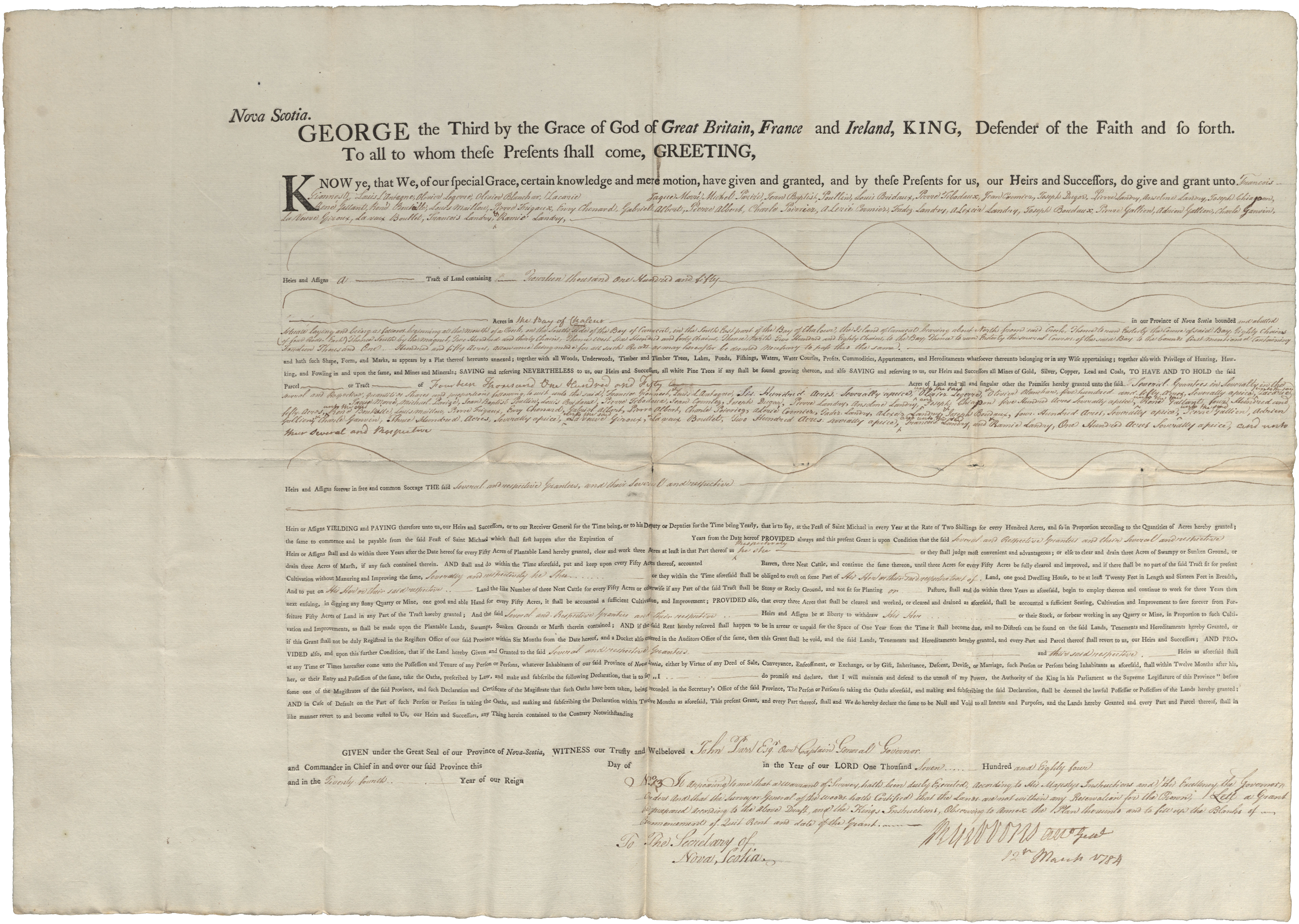 Acadians. Warrant to Survey includes a "Liste des nom." Granted 14 150 acres land at Bay Chaleur.