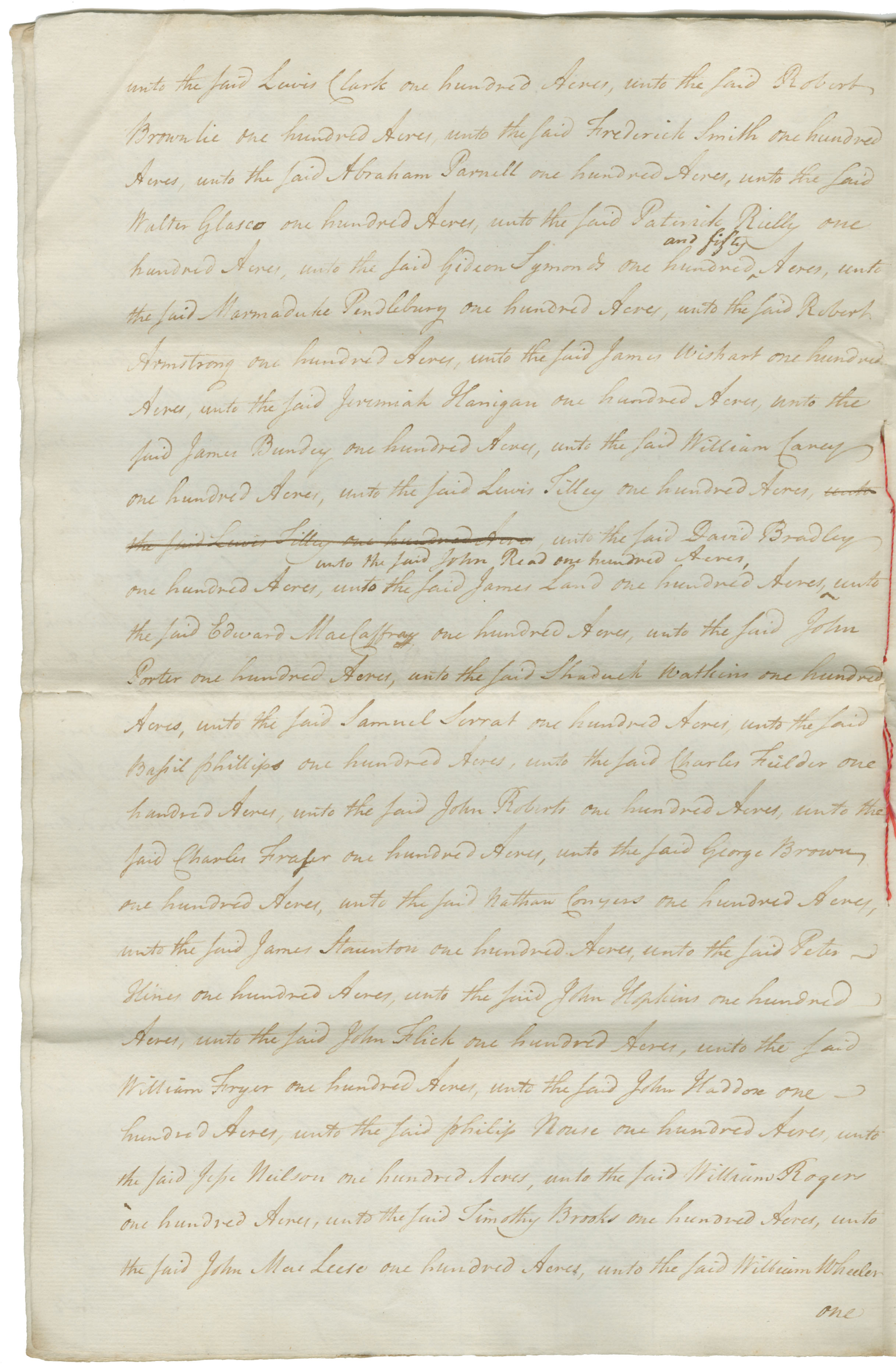 The Duke of Cumberland's Regiment and Loyalists from St. Augustine. Granted 30,700 acres in the Township of Manchester, on Chedabucto Bay (near land granted I. Boyd) to the mouth of a small Riverlet entering the Gut of Canso and from Benjamin Hollowell's Grant on Milford Haven to the sea shore of Chedebucto Bay. Containing in all 50,000 acres, in which the 30,700 acres is included as well as 13,744 acres reserved to the Crown and land allowed for a Town Plot, Glebe, School Lots, Roads and further Grants.