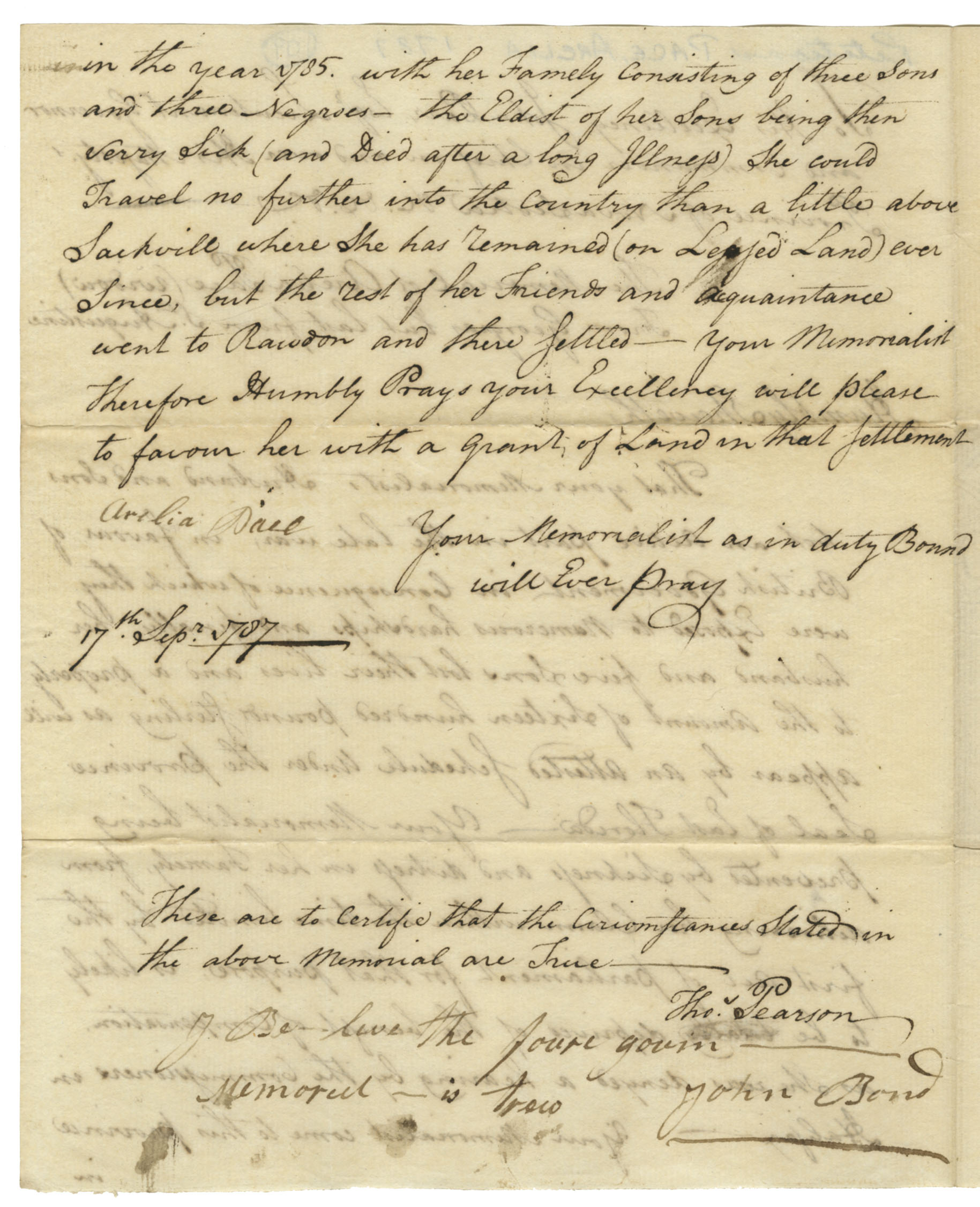 Her husband and sons took an active part in the late war in favor of the British government in consequence of which they were exposed to hardships and finally the husband and five sons lost their lives and a property to the amount of 1600 pounds sterling. Memorialist being prevented by sickness and distress from delivering her claim within the time limited by the first act of Parliament for the purpose is likely to be deprived of the benefits of compensation, as she was denied a hearing by the commissioners at Halifax. Came to the province in 1785 with three sons and three negroes. The eldest of her sons being then very ill [has since died], she could travel no further into the country than a little above Sackville, where she has remained on leased land ever since. The rest of her friends settled at Rawdon, and she requests a grant of land at that place.