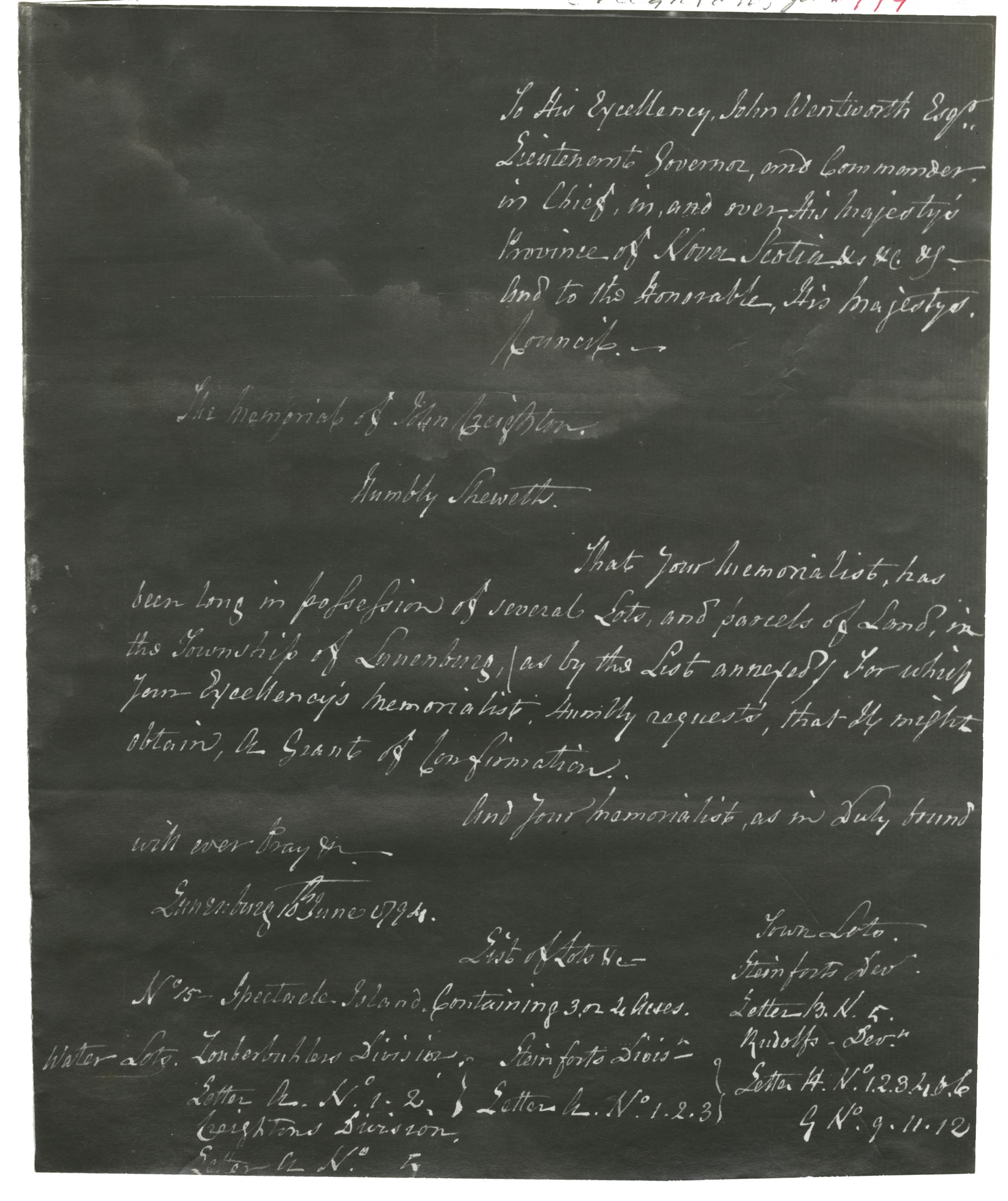 Memorial for a Grant of Confirmation to several lots and parcels of land in the township of Lunenburg which had long been in his possession.