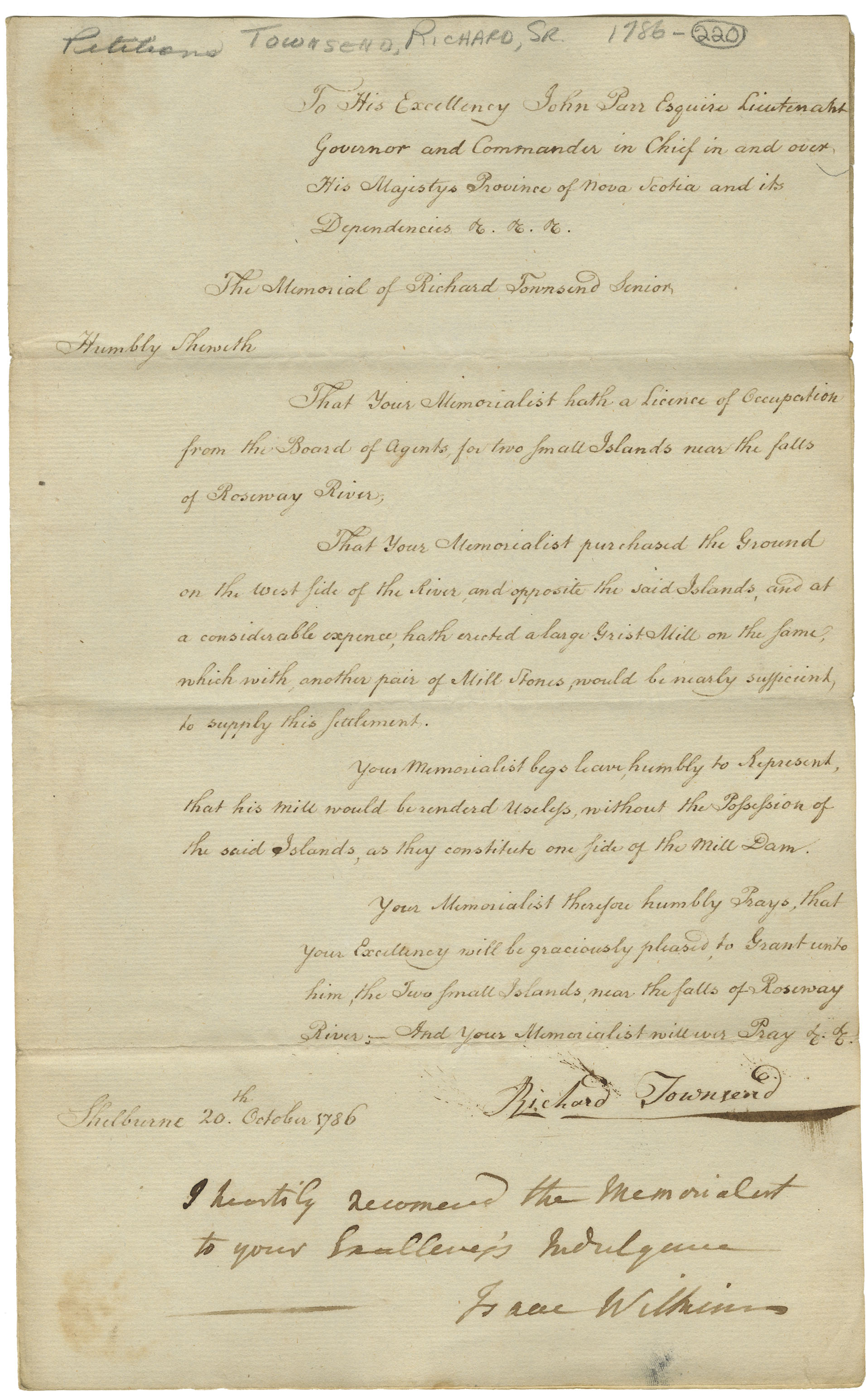 Memorialist has a license of occupation from the Board of Agents, for two small islands near the falls of the Roseway River. Owns land on the west side of the river, where he has erected a grist mill, which "would be rendered useless without the possession of the said island as they constitute one side of the mill dam. Prays for a grant of the islands.