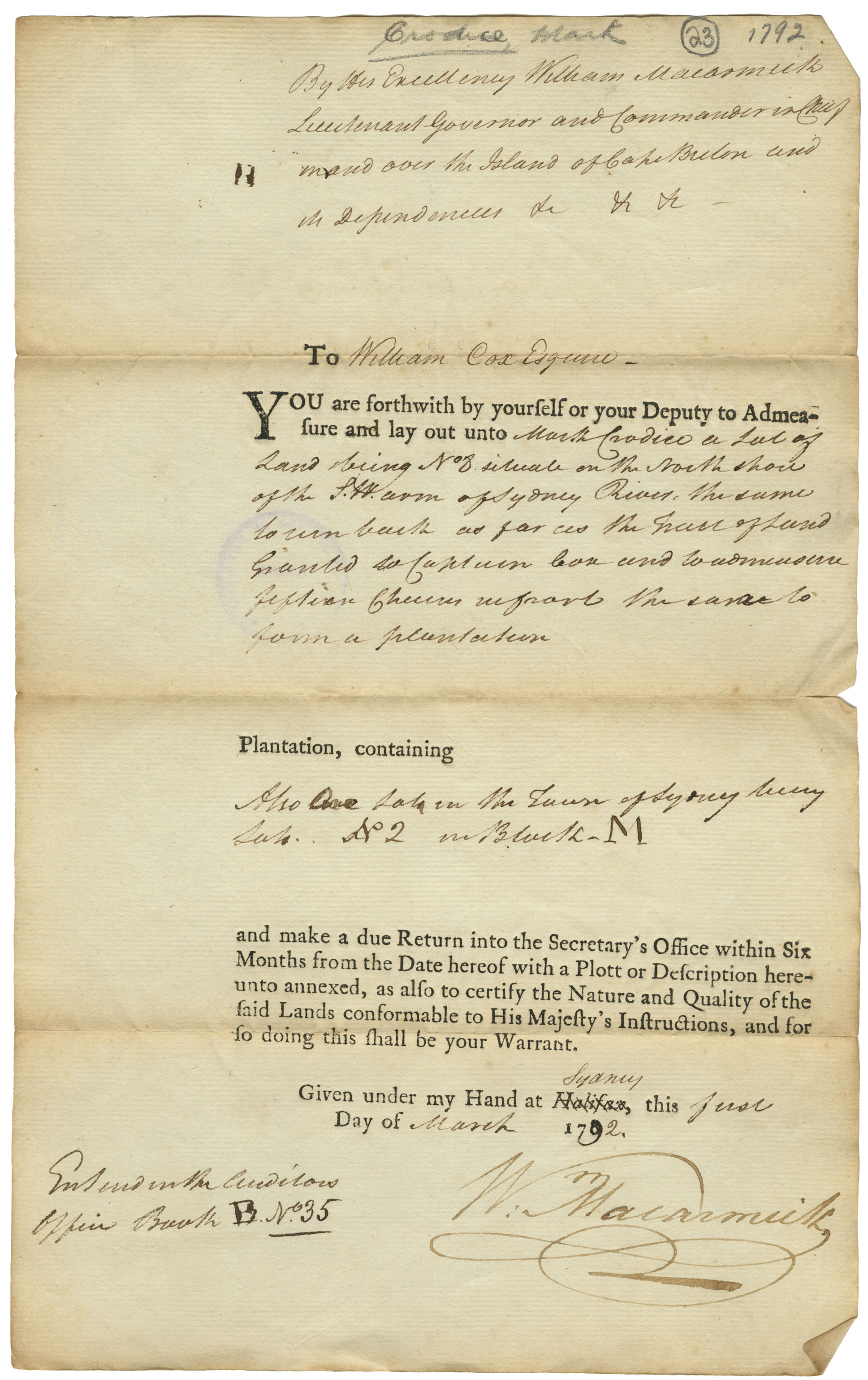 Warrant to survey; also report of survey. South West Arm, Sydney River also town lot in Sydney