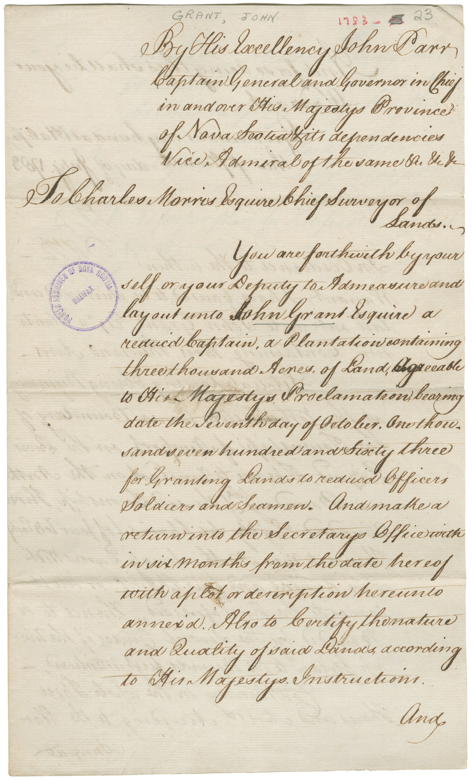 Warrant to Survey: Lay out unto John Grant, a reduced Captain, a plantation containing 3000 acres of land. Surveyor's Report: Township of Newport, on the River Piziquid. Containing in the whole 3000 acres. "Grant signed 26th August 1783."