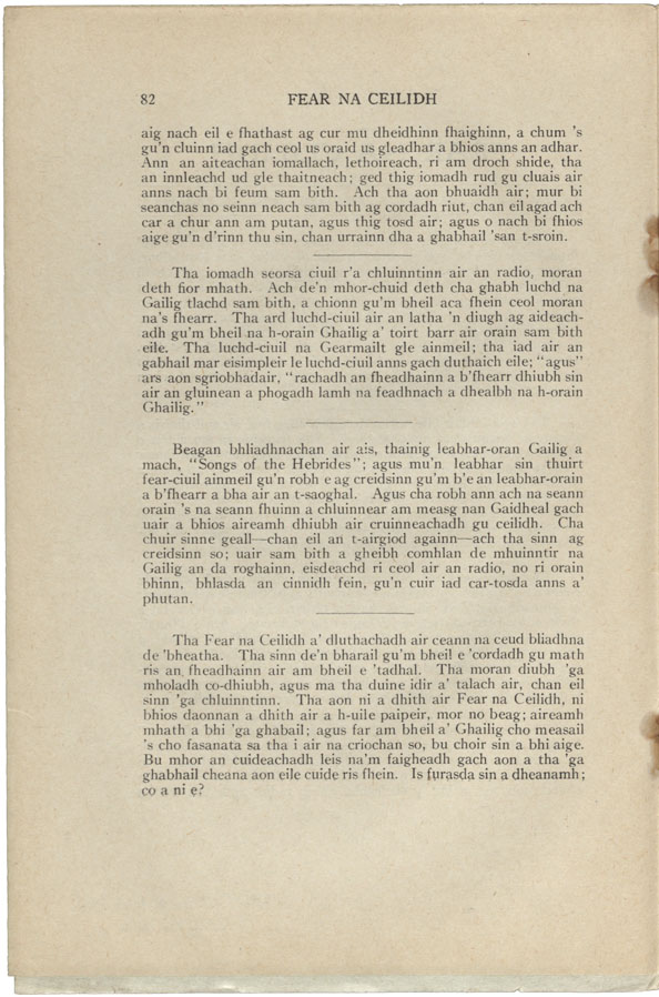 Published monthly out of Sydney, Cape Breton, Fear na Céilidh was bound rather than taking the traditional form of a newspaper, and included advertisements, largely in English with images, on the front and back covers. The newspaper itself was published entirely in Gaelic, in an effort to preserve and cultivate that beautiful language. The newspaper promised a "well-edited selection of interesting reading, carefully written and correctly printed." The annual subscription was $1.00 for 12 issues — a small price to pay for maintaining and promoting the language.