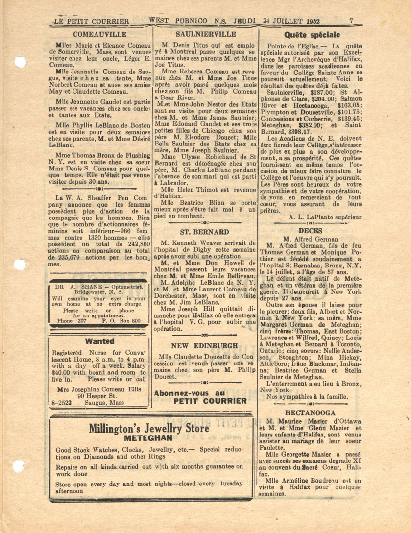 Le Courrier is Nova Scotia's leading French-language newspaper, and the only one with province-wide coverage and distribution. First published by Désiré d'Éon as Le Petit Courrier (Du Sud-Ouest de la Nouvelle-Écosse) on 10 February 1937, it has appeared weekly ever since, informing its readers, defending the interests of Acadians and francophones, and providing a bridge linking all Acadian regions in the province. It offers community news and events, extended articles, advertisements, announcements, photographs and special supplements, all directed towards supporting Nova Scotia's large, dispersed and diversified Acadian population, its businesses, industries, economy, daily activities, schools and higher education, politics, cultural life and heritage. Le Courrier offers an outstanding and unparalleled perspective on 66 years' accumulated history of Nova Scotia's Acadian population, thus enabling exploration of interests, activities, accomplishments, concerns and community issues across a broad swath of the 20th century.