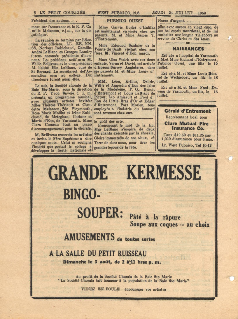 Le Courrier is Nova Scotia's leading French-language newspaper, and the only one with province-wide coverage and distribution. First published by Désiré d'Éon as Le Petit Courrier (Du Sud-Ouest de la Nouvelle-Écosse) on 10 February 1937, it has appeared weekly ever since, informing its readers, defending the interests of Acadians and francophones, and providing a bridge linking all Acadian regions in the province. It offers community news and events, extended articles, advertisements, announcements, photographs and special supplements, all directed towards supporting Nova Scotia's large, dispersed and diversified Acadian population, its businesses, industries, economy, daily activities, schools and higher education, politics, cultural life and heritage. Le Courrier offers an outstanding and unparalleled perspective on 66 years' accumulated history of Nova Scotia's Acadian population, thus enabling exploration of interests, activities, accomplishments, concerns and community issues across a broad swath of the 20th century.