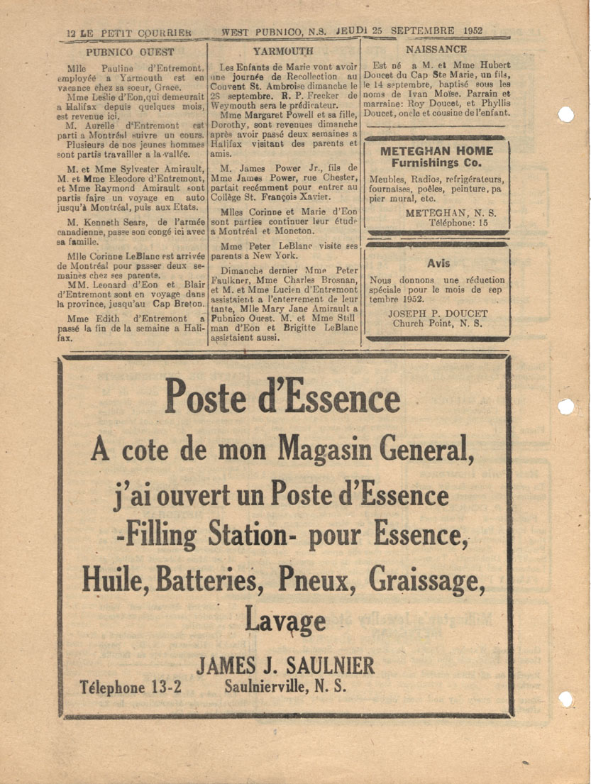 Le Courrier is Nova Scotia's leading French-language newspaper, and the only one with province-wide coverage and distribution. First published by Désiré d'Éon as Le Petit Courrier (Du Sud-Ouest de la Nouvelle-Écosse) on 10 February 1937, it has appeared weekly ever since, informing its readers, defending the interests of Acadians and francophones, and providing a bridge linking all Acadian regions in the province. It offers community news and events, extended articles, advertisements, announcements, photographs and special supplements, all directed towards supporting Nova Scotia's large, dispersed and diversified Acadian population, its businesses, industries, economy, daily activities, schools and higher education, politics, cultural life and heritage. Le Courrier offers an outstanding and unparalleled perspective on 66 years' accumulated history of Nova Scotia's Acadian population, thus enabling exploration of interests, activities, accomplishments, concerns and community issues across a broad swath of the 20th century.