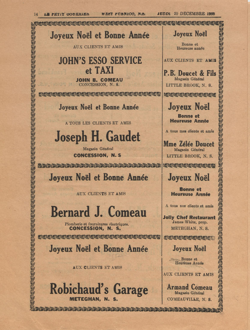Le Courrier is Nova Scotia's leading French-language newspaper, and the only one with province-wide coverage and distribution. First published by Désiré d'Éon as Le Petit Courrier (Du Sud-Ouest de la Nouvelle-Écosse) on 10 February 1937, it has appeared weekly ever since, informing its readers, defending the interests of Acadians and francophones, and providing a bridge linking all Acadian regions in the province. It offers community news and events, extended articles, advertisements, announcements, photographs and special supplements, all directed towards supporting Nova Scotia's large, dispersed and diversified Acadian population, its businesses, industries, economy, daily activities, schools and higher education, politics, cultural life and heritage. Le Courrier offers an outstanding and unparalleled perspective on 66 years' accumulated history of Nova Scotia's Acadian population, thus enabling exploration of interests, activities, accomplishments, concerns and community issues across a broad swath of the 20th century.