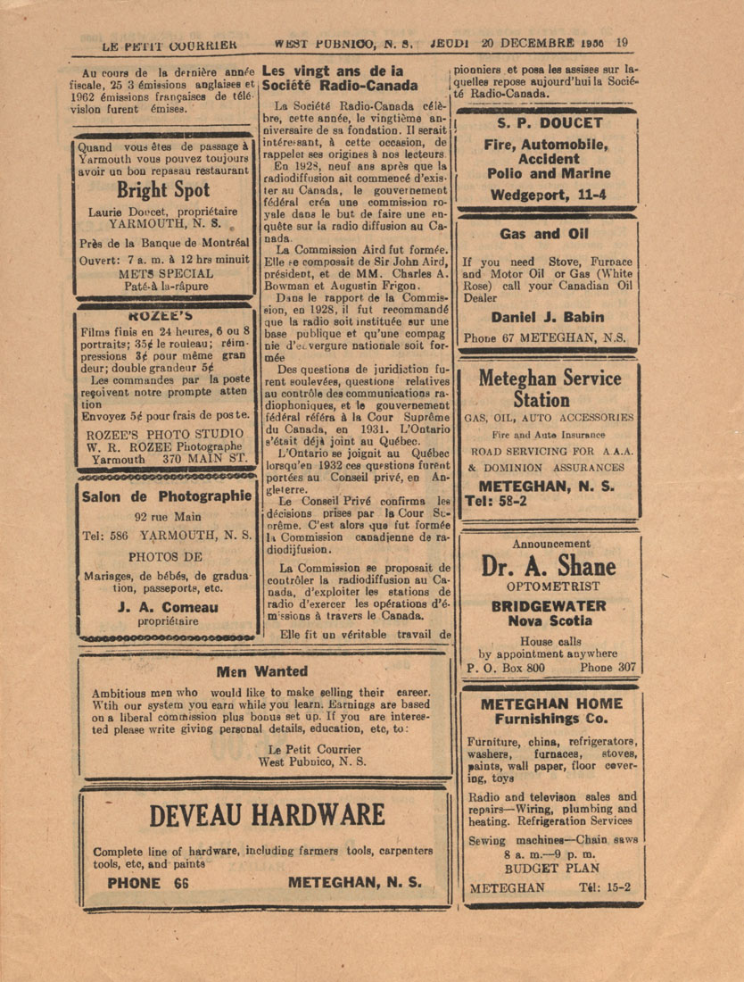 Le Courrier is Nova Scotia's leading French-language newspaper, and the only one with province-wide coverage and distribution. First published by Désiré d'Éon as Le Petit Courrier (Du Sud-Ouest de la Nouvelle-Écosse) on 10 February 1937, it has appeared weekly ever since, informing its readers, defending the interests of Acadians and francophones, and providing a bridge linking all Acadian regions in the province. It offers community news and events, extended articles, advertisements, announcements, photographs and special supplements, all directed towards supporting Nova Scotia's large, dispersed and diversified Acadian population, its businesses, industries, economy, daily activities, schools and higher education, politics, cultural life and heritage. Le Courrier offers an outstanding and unparalleled perspective on 66 years' accumulated history of Nova Scotia's Acadian population, thus enabling exploration of interests, activities, accomplishments, concerns and community issues across a broad swath of the 20th century.