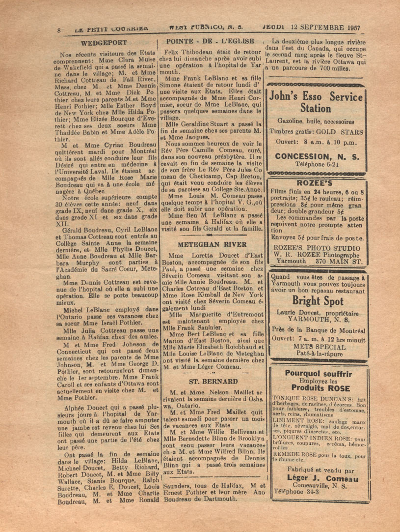 Le Courrier is Nova Scotia's leading French-language newspaper, and the only one with province-wide coverage and distribution. First published by Désiré d'Éon as Le Petit Courrier (Du Sud-Ouest de la Nouvelle-Écosse) on 10 February 1937, it has appeared weekly ever since, informing its readers, defending the interests of Acadians and francophones, and providing a bridge linking all Acadian regions in the province. It offers community news and events, extended articles, advertisements, announcements, photographs and special supplements, all directed towards supporting Nova Scotia's large, dispersed and diversified Acadian population, its businesses, industries, economy, daily activities, schools and higher education, politics, cultural life and heritage. Le Courrier offers an outstanding and unparalleled perspective on 66 years' accumulated history of Nova Scotia's Acadian population, thus enabling exploration of interests, activities, accomplishments, concerns and community issues across a broad swath of the 20th century.