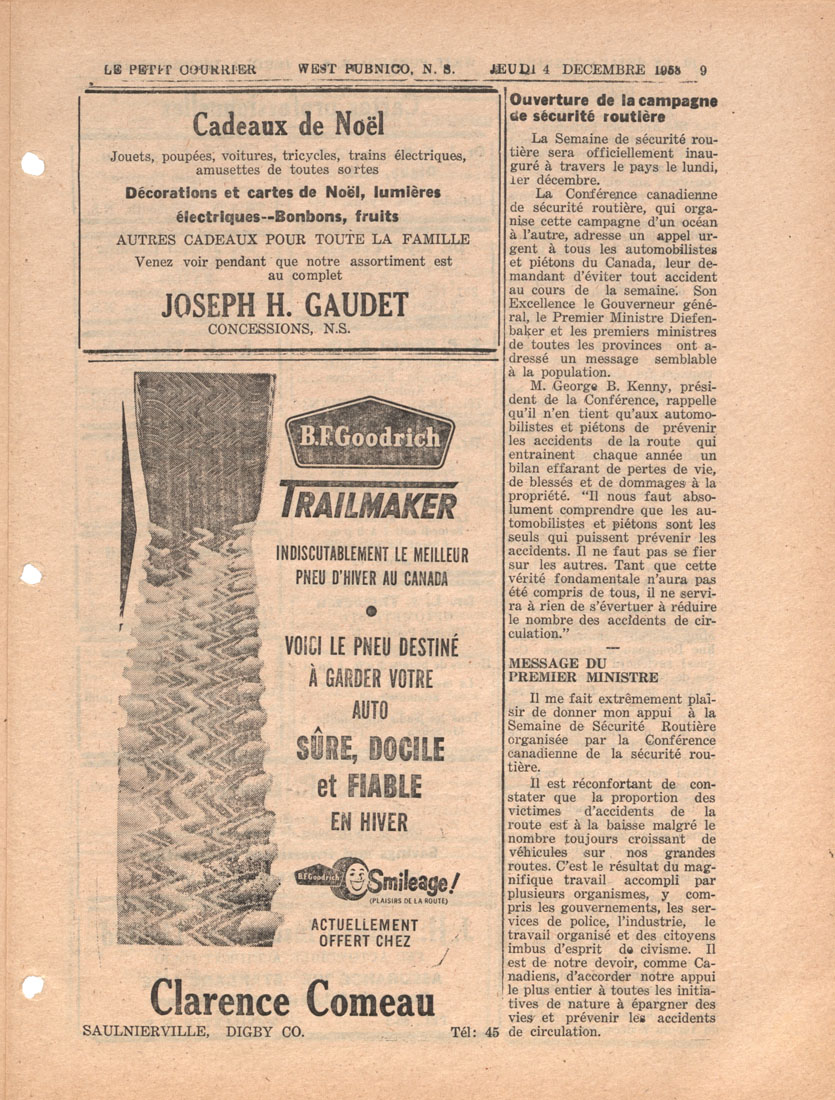 Le Courrier is Nova Scotia's leading French-language newspaper, and the only one with province-wide coverage and distribution. First published by Désiré d'Éon as Le Petit Courrier (Du Sud-Ouest de la Nouvelle-Écosse) on 10 February 1937, it has appeared weekly ever since, informing its readers, defending the interests of Acadians and francophones, and providing a bridge linking all Acadian regions in the province. It offers community news and events, extended articles, advertisements, announcements, photographs and special supplements, all directed towards supporting Nova Scotia's large, dispersed and diversified Acadian population, its businesses, industries, economy, daily activities, schools and higher education, politics, cultural life and heritage. Le Courrier offers an outstanding and unparalleled perspective on 66 years' accumulated history of Nova Scotia's Acadian population, thus enabling exploration of interests, activities, accomplishments, concerns and community issues across a broad swath of the 20th century.