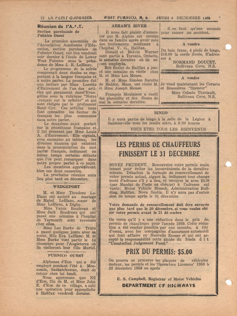 Le Courrier is Nova Scotia's leading French-language newspaper, and the only one with province-wide coverage and distribution. First published by Désiré d'Éon as Le Petit Courrier (Du Sud-Ouest de la Nouvelle-Écosse) on 10 February 1937, it has appeared weekly ever since, informing its readers, defending the interests of Acadians and francophones, and providing a bridge linking all Acadian regions in the province. It offers community news and events, extended articles, advertisements, announcements, photographs and special supplements, all directed towards supporting Nova Scotia's large, dispersed and diversified Acadian population, its businesses, industries, economy, daily activities, schools and higher education, politics, cultural life and heritage. Le Courrier offers an outstanding and unparalleled perspective on 66 years' accumulated history of Nova Scotia's Acadian population, thus enabling exploration of interests, activities, accomplishments, concerns and community issues across a broad swath of the 20th century.