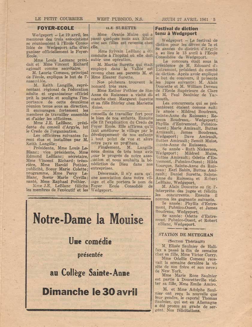 Le Courrier is Nova Scotia's leading French-language newspaper, and the only one with province-wide coverage and distribution. First published by Désiré d'Éon as Le Petit Courrier (Du Sud-Ouest de la Nouvelle-Écosse) on 10 February 1937, it has appeared weekly ever since, informing its readers, defending the interests of Acadians and francophones, and providing a bridge linking all Acadian regions in the province. It offers community news and events, extended articles, advertisements, announcements, photographs and special supplements, all directed towards supporting Nova Scotia's large, dispersed and diversified Acadian population, its businesses, industries, economy, daily activities, schools and higher education, politics, cultural life and heritage. Le Courrier offers an outstanding and unparalleled perspective on 66 years' accumulated history of Nova Scotia's Acadian population, thus enabling exploration of interests, activities, accomplishments, concerns and community issues across a broad swath of the 20th century.