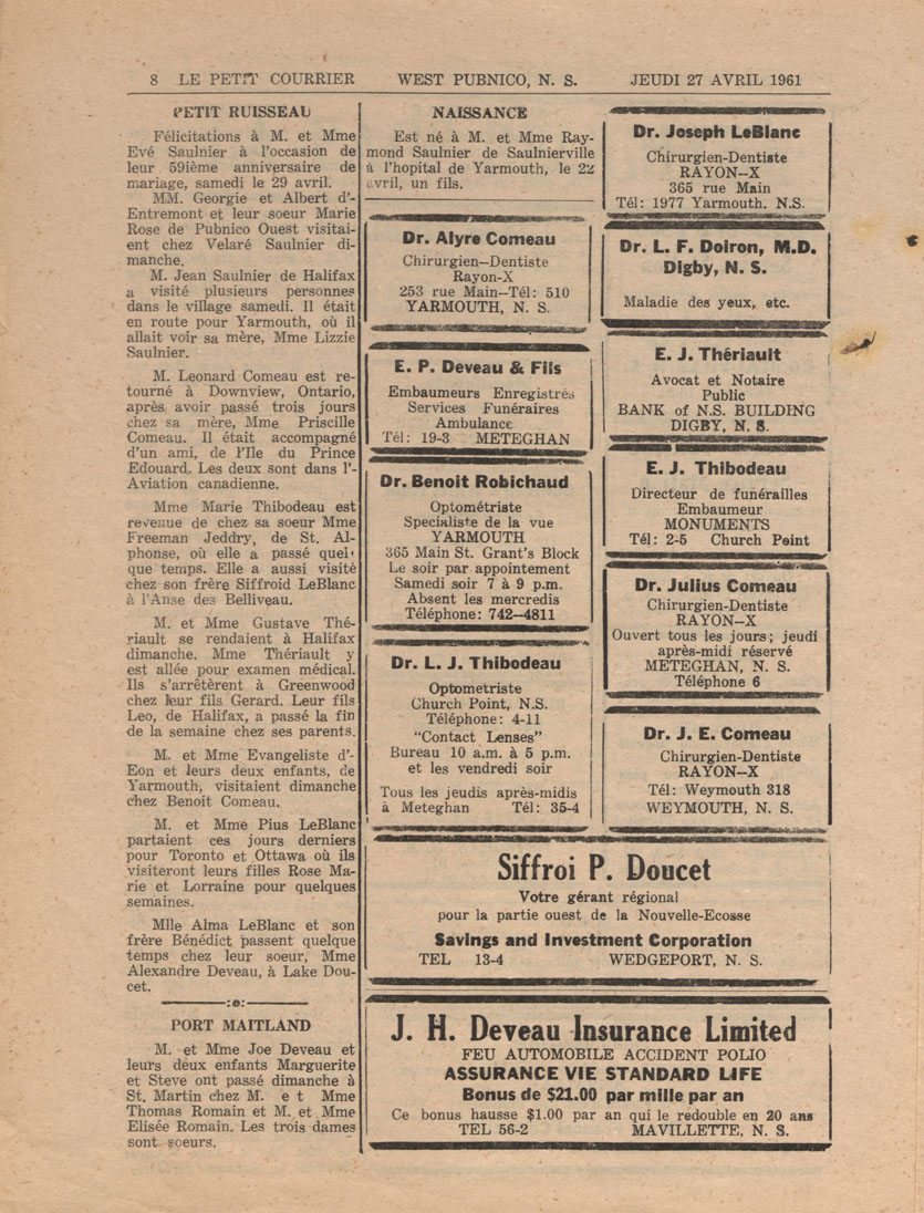 Le Courrier is Nova Scotia's leading French-language newspaper, and the only one with province-wide coverage and distribution. First published by Désiré d'Éon as Le Petit Courrier (Du Sud-Ouest de la Nouvelle-Écosse) on 10 February 1937, it has appeared weekly ever since, informing its readers, defending the interests of Acadians and francophones, and providing a bridge linking all Acadian regions in the province. It offers community news and events, extended articles, advertisements, announcements, photographs and special supplements, all directed towards supporting Nova Scotia's large, dispersed and diversified Acadian population, its businesses, industries, economy, daily activities, schools and higher education, politics, cultural life and heritage. Le Courrier offers an outstanding and unparalleled perspective on 66 years' accumulated history of Nova Scotia's Acadian population, thus enabling exploration of interests, activities, accomplishments, concerns and community issues across a broad swath of the 20th century.