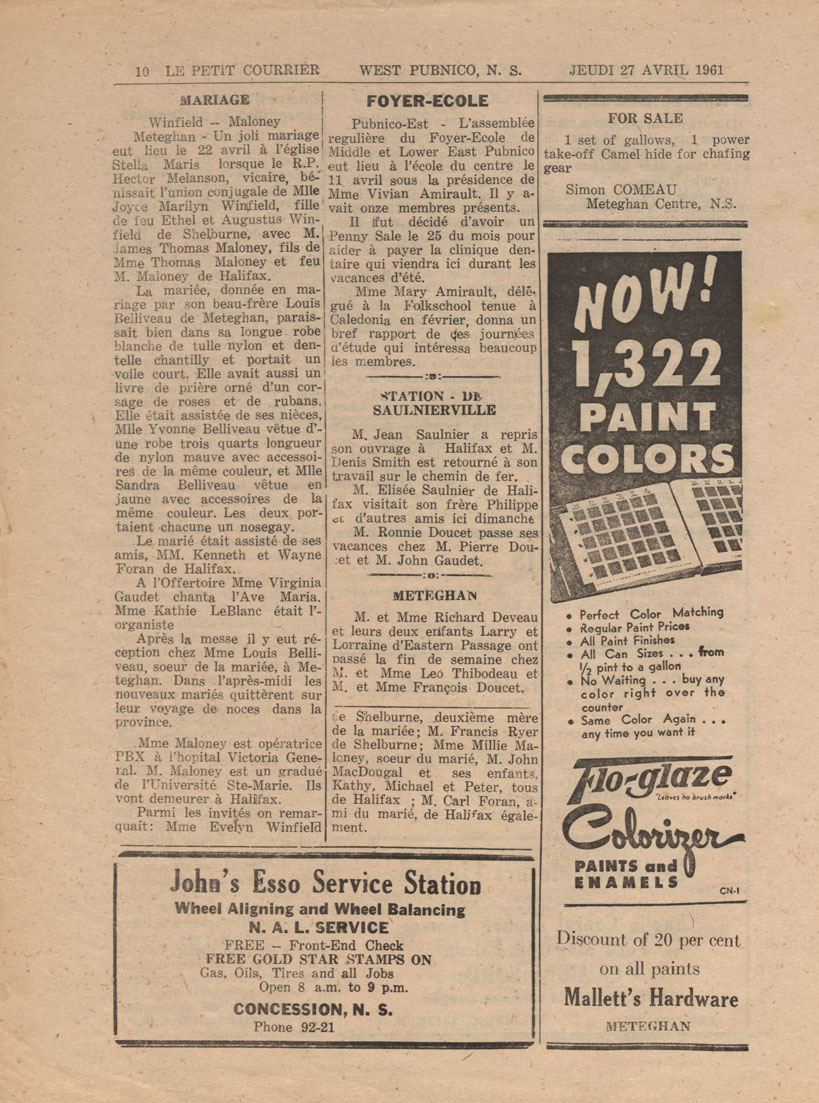 Le Courrier is Nova Scotia's leading French-language newspaper, and the only one with province-wide coverage and distribution. First published by Désiré d'Éon as Le Petit Courrier (Du Sud-Ouest de la Nouvelle-Écosse) on 10 February 1937, it has appeared weekly ever since, informing its readers, defending the interests of Acadians and francophones, and providing a bridge linking all Acadian regions in the province. It offers community news and events, extended articles, advertisements, announcements, photographs and special supplements, all directed towards supporting Nova Scotia's large, dispersed and diversified Acadian population, its businesses, industries, economy, daily activities, schools and higher education, politics, cultural life and heritage. Le Courrier offers an outstanding and unparalleled perspective on 66 years' accumulated history of Nova Scotia's Acadian population, thus enabling exploration of interests, activities, accomplishments, concerns and community issues across a broad swath of the 20th century.